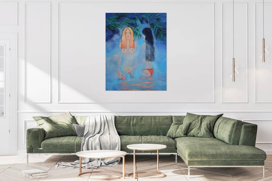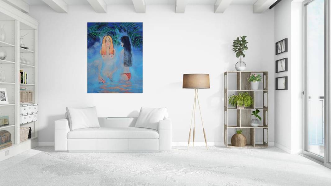 This captivating acrylic on canvas painting plunges the viewer into an ethereal, aquatic realm where two female figures emerge from a swirling, cerulean mist. The scene is both serene and sensual, evoking a dreamlike quality that tantalizes the imagination.