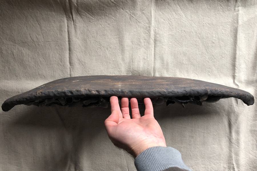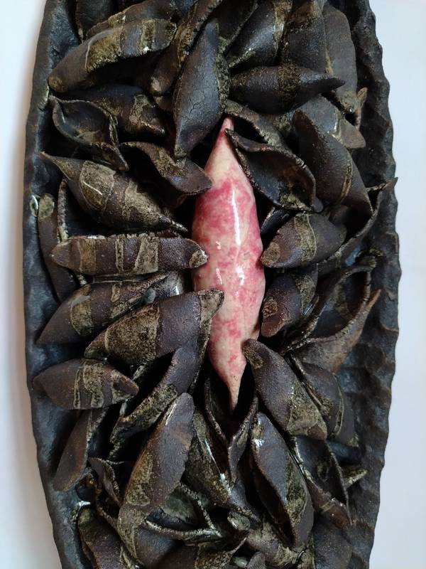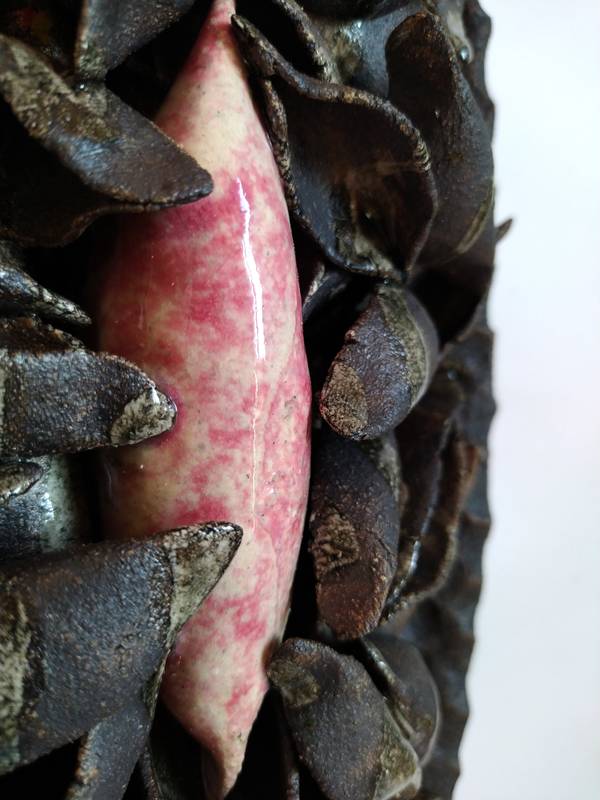 Fireclay mass, glaze, metal oxides, smoking, wood firing.