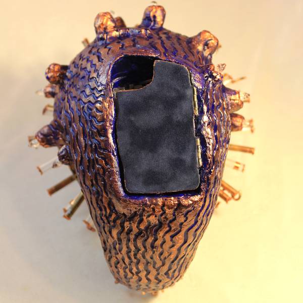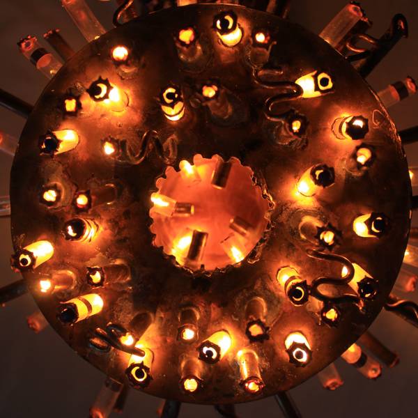The top is made from copper, and the blue foundation from clay. Inside is a light system that works from batteries.