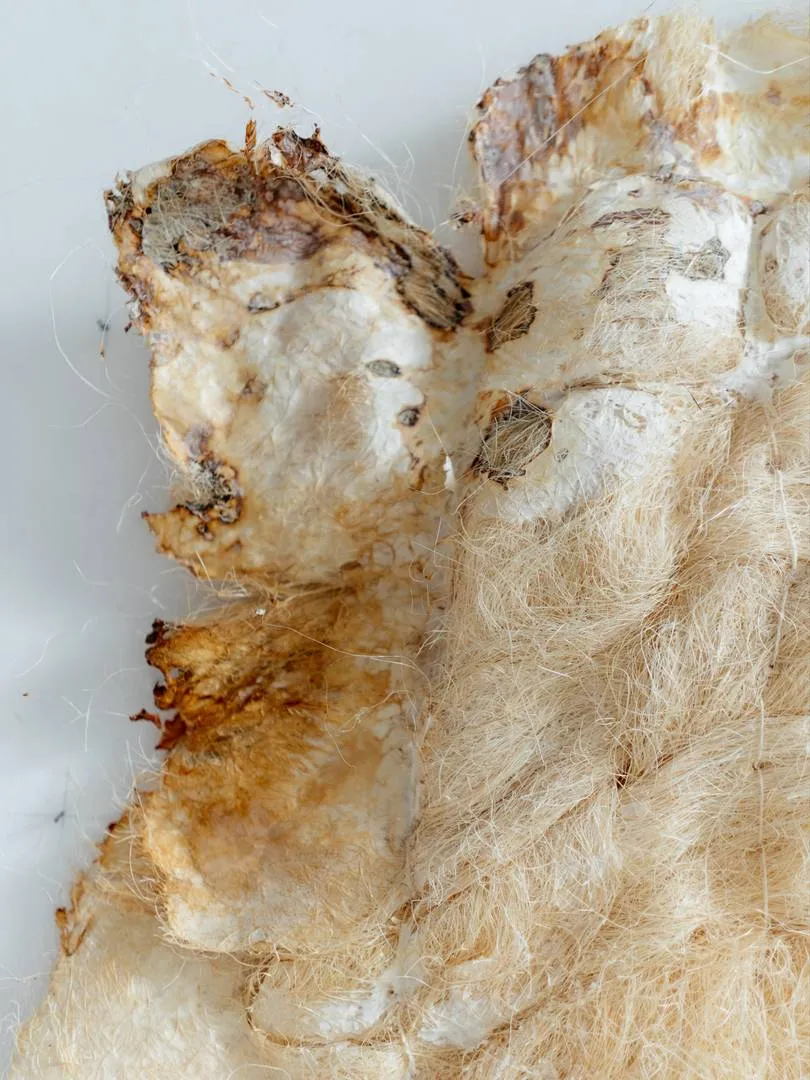 Her studio is unlike any I’ seen before. It’ not just a workshop, it’ part textile lab, part microbiology station, part experimental farm. A place where science and creativity intertwine seamlessly. She works with living organisms, primarily mycelium, the vast underground network of fungi that connects trees and plants beneath forests. But here, in her hands, mycelium doesn’ just connect nature, it creates. It grows into textiles, forming intricate patterns and textures, embedding itself into the very fabric of her art.