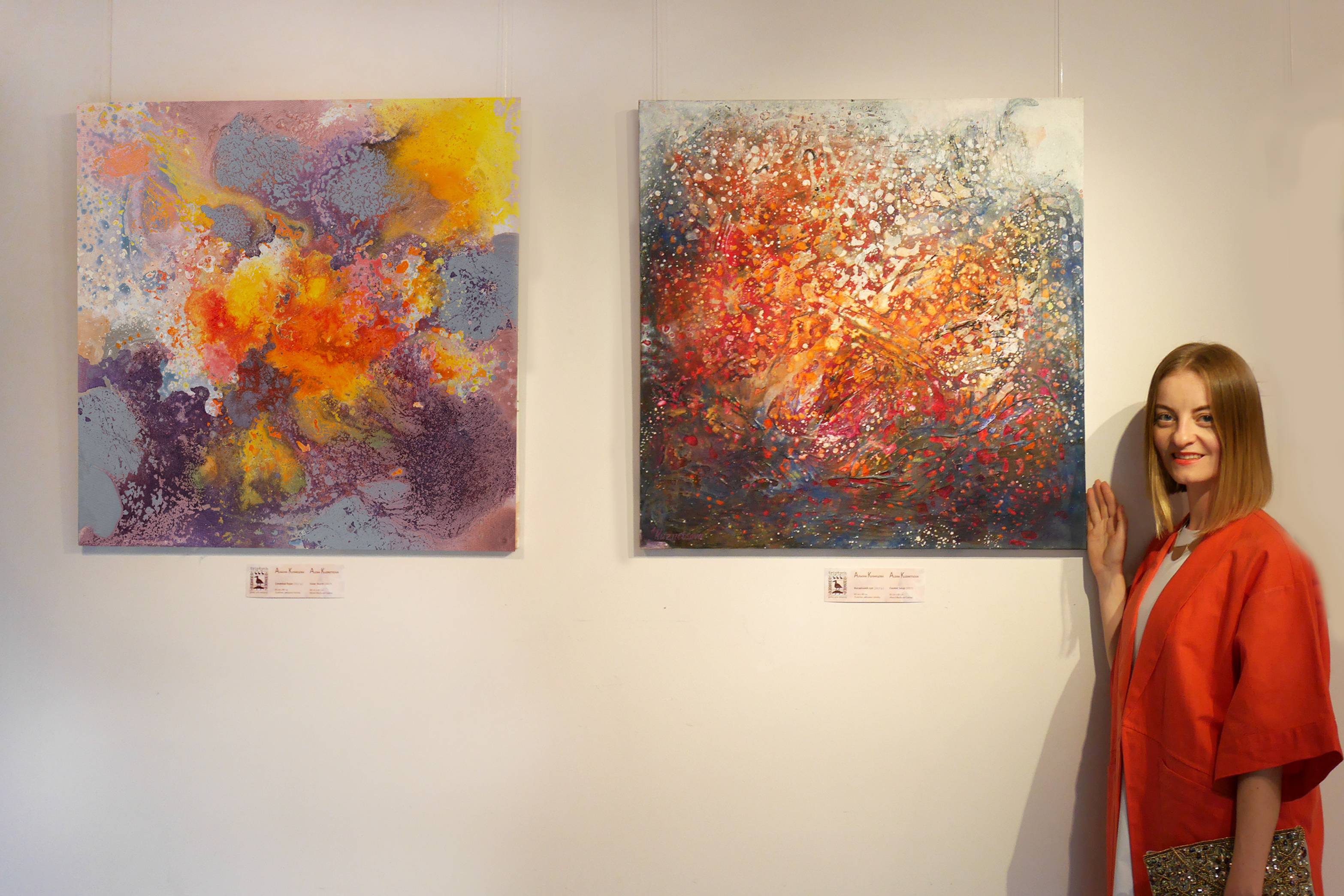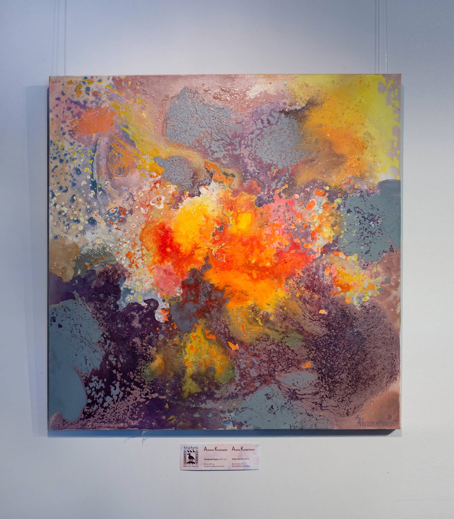 A bright painting in my liquid (author) technique, Sun Storm, refers to the cosmic topic and reminds one of space nebulae. Beautiful fractal details could be discovered at close distance.