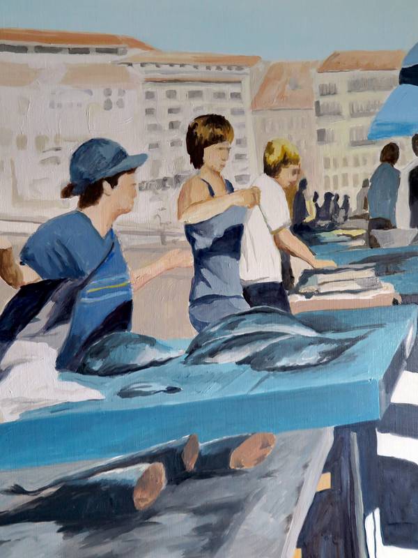 Scène de marché au poisson à la crié sur le vieux port de Marseille. Les personnages sont plongés dans la forte luminosité du sud, tout s'amalgame (personnages, architectures, étales de poissons, ombres et lumières) En la regardant, on ressent la chaleur du soleil et l'agitation apaisée d'un marché, une scène où chaque geste raconte une histoire.