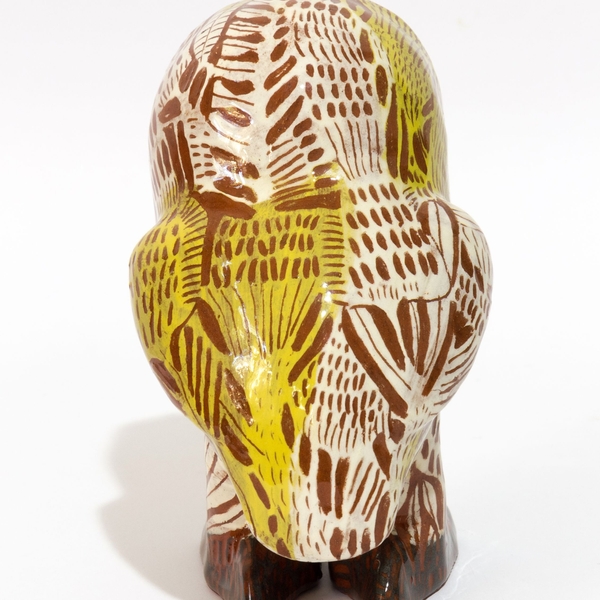 The work is decorated with engobe and glaze. The work is then fired in an electric kiln twice, the second time at a temperature of about 1060c.