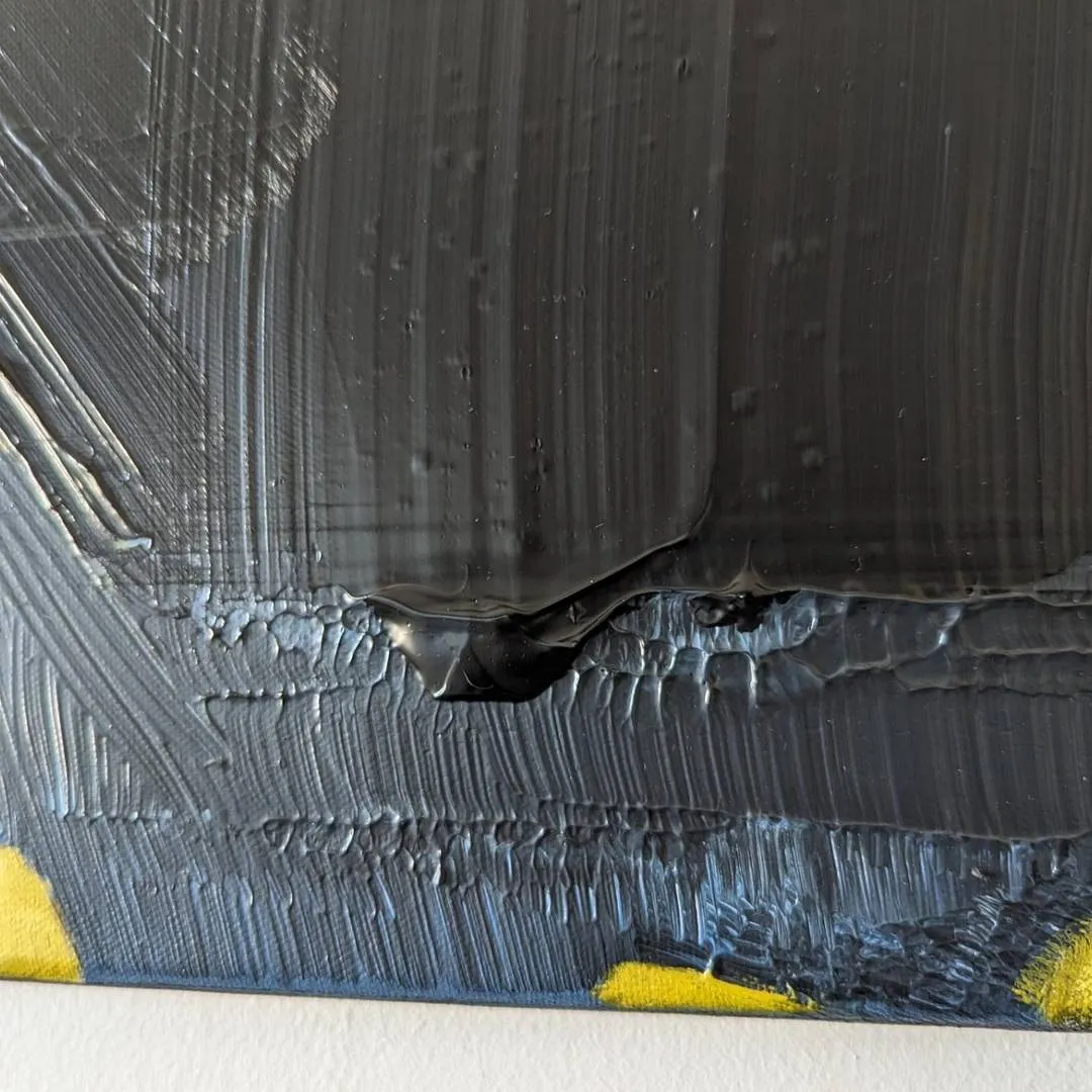 Les traces, noires et parfois bleues, dynamiques, se mêlent aux éclats de jaune lumineux, évoquant une lutte entre l'ombre et la lumière.
