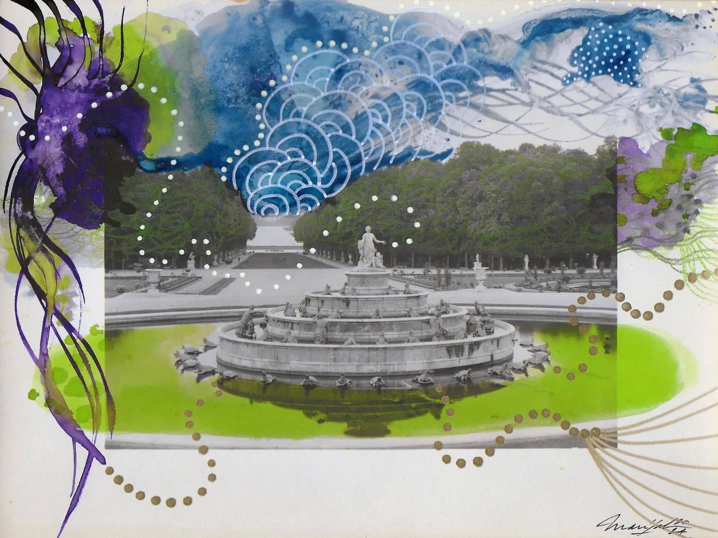 A hybrid work based on a vintage photograph of the Versailles gardens, bought at a flea market, on which I've painted organic motifs inspired by nature. The contrast between the black-and-white of the photograph and the bright colors of my appliqués is a deliberate choice to evoke the idea of my inner world, dynamic, exuberant and teeming.