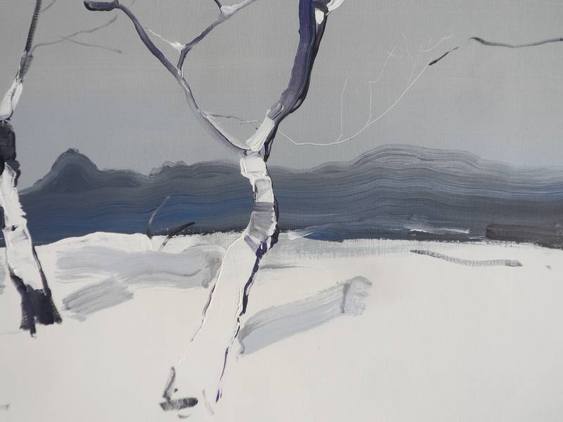 Thin strokes of acrylic add texture and depth, allowing one to feel the roughness of the tree bark and the softness of the snow underfoot. The painting invites the viewer to reflect on the past, which remains unchanged, and the present, which we create here and now.