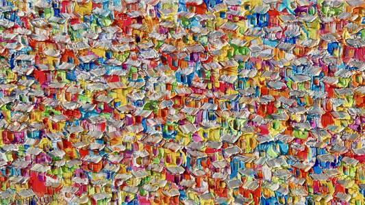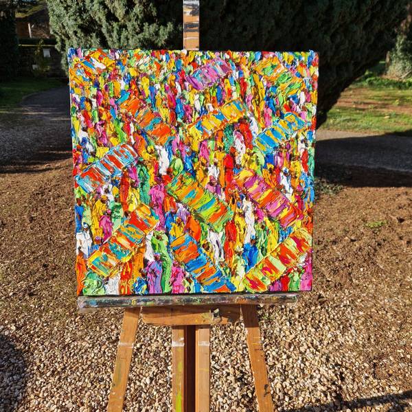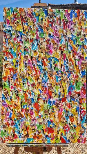 In this vibrant oil painting, I've captured the lively spirit of a bustling market through a dance of colors and textures. Employing an impressionistic and semi-abstract approach, each stroke is a testament to the energy and diversity found within communal spaces. My intention was to create a piece that pulsates with joy and brings an effervescent atmosphere into any room it graces.