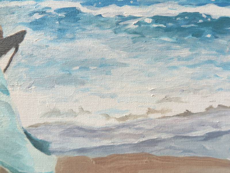 Cette peinture illustre un instant fugace saisi sur le vif en Corse. Les embruns de la mer agitée et la luminosité intense du soleil du sud contrastent avec la sérénité du personnage vu de dos. C'est une description picturale d'une atmosphère ressentie, qui éveille les sens à travers l'art. La peinture devient un moyen d'exprimer toutes les émotions éprouvées.