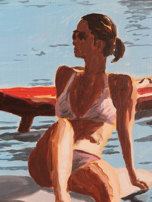L’artiste sélectionne minutieusement ses motifs parmis des photos issues de ses propres shooting où se trouvent des interactions entre les personnages dans des territoires ensoleillés. Elle représente ces clichés en peinture à l’huile sur toile, en les recadrant et sélectionnant ses couleurs. Sa touche est emprunte de ce que sa vue a digéré, son ressenti à filtré. S’établit un processus créatif pour traduire la lumière et les mouvements des personnages. Dans ses œuvres la lumière a fonction de composition. La peintre décrit la lumière et le mouvement de façon radicale. Elle théâtralise, sacralise une réalité d’apparence banale.
