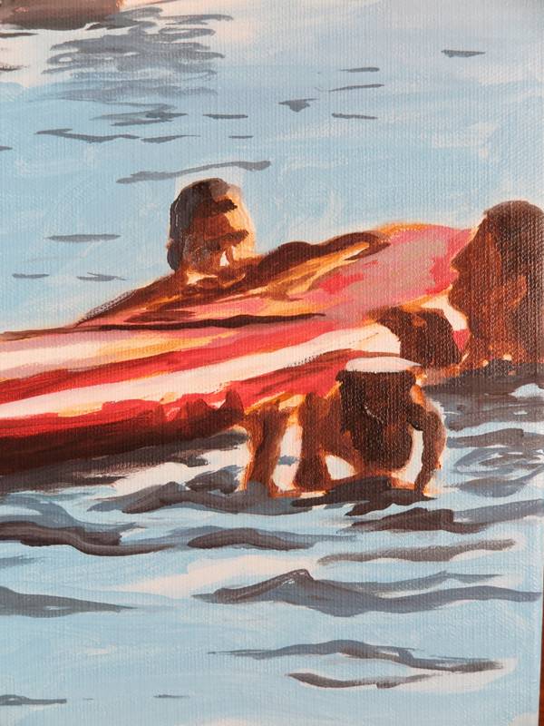 Scène de plage sur la plage de Caspiu dans le golfe de Porto. La lumière fait partie intégrante de la composition. Les personnages semblent communiquer entre eux ou pas.