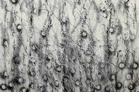 Multilayered, vibrating canvases of woven lines create abstract compositions, images, and figures. The artist calls the technique of drawing lines on a canvas "rhizomes", according to the term "rhizome", which literally means "rootstock", or a system of nonlinear ties. The work is an associative abstraction. Every time you can see and find something new in a combination of oil lines and tones.