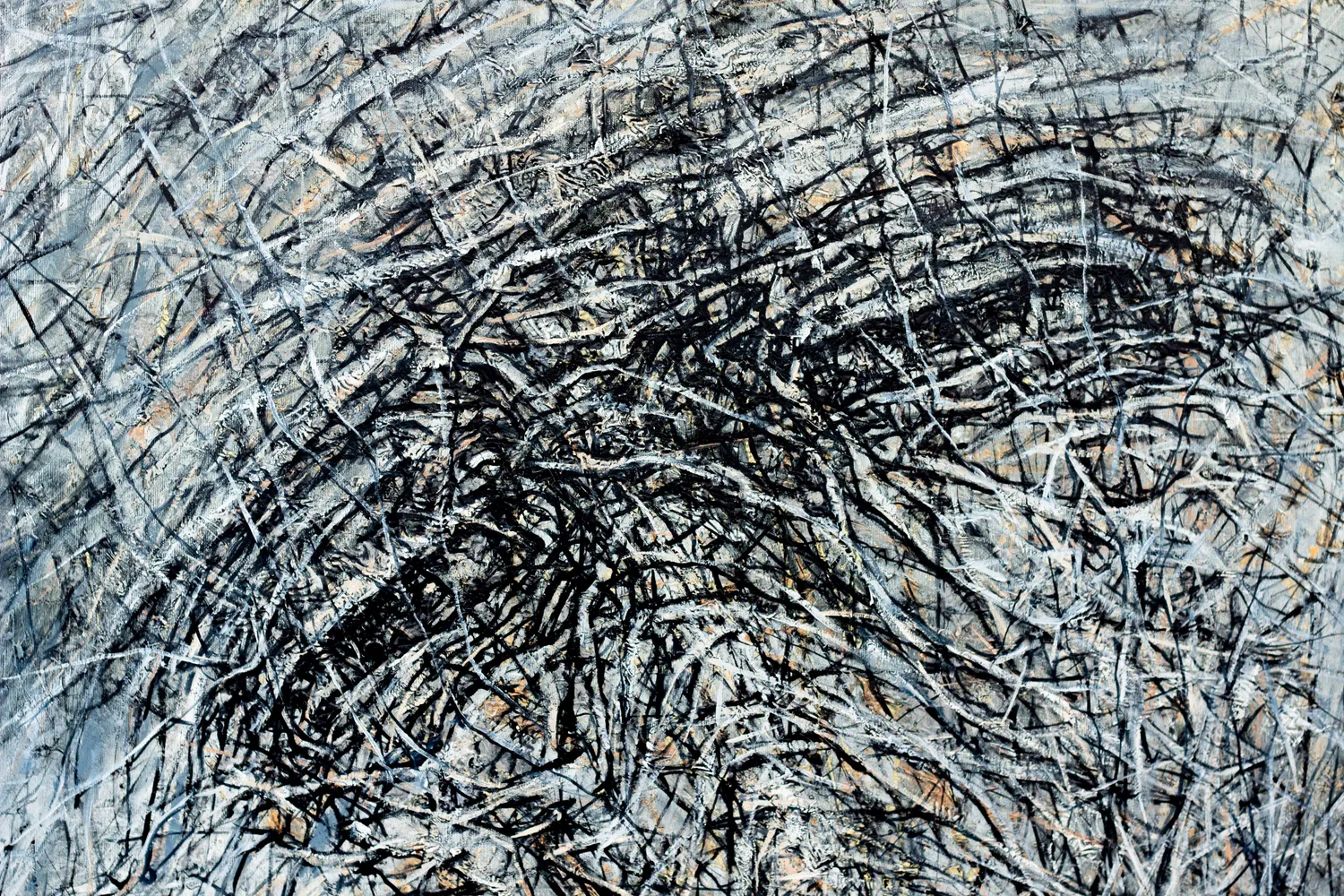 Multilayered, vibrating canvases of woven lines create abstract compositions, images, and figures. The artist calls the technique of drawing lines on a canvas "rhizomes", according to the term "rhizome", which literally means "rootstock", or a system of nonlinear ties. The work is an associative abstraction. Every time you can see and find something new in a combination of oil lines and tones.