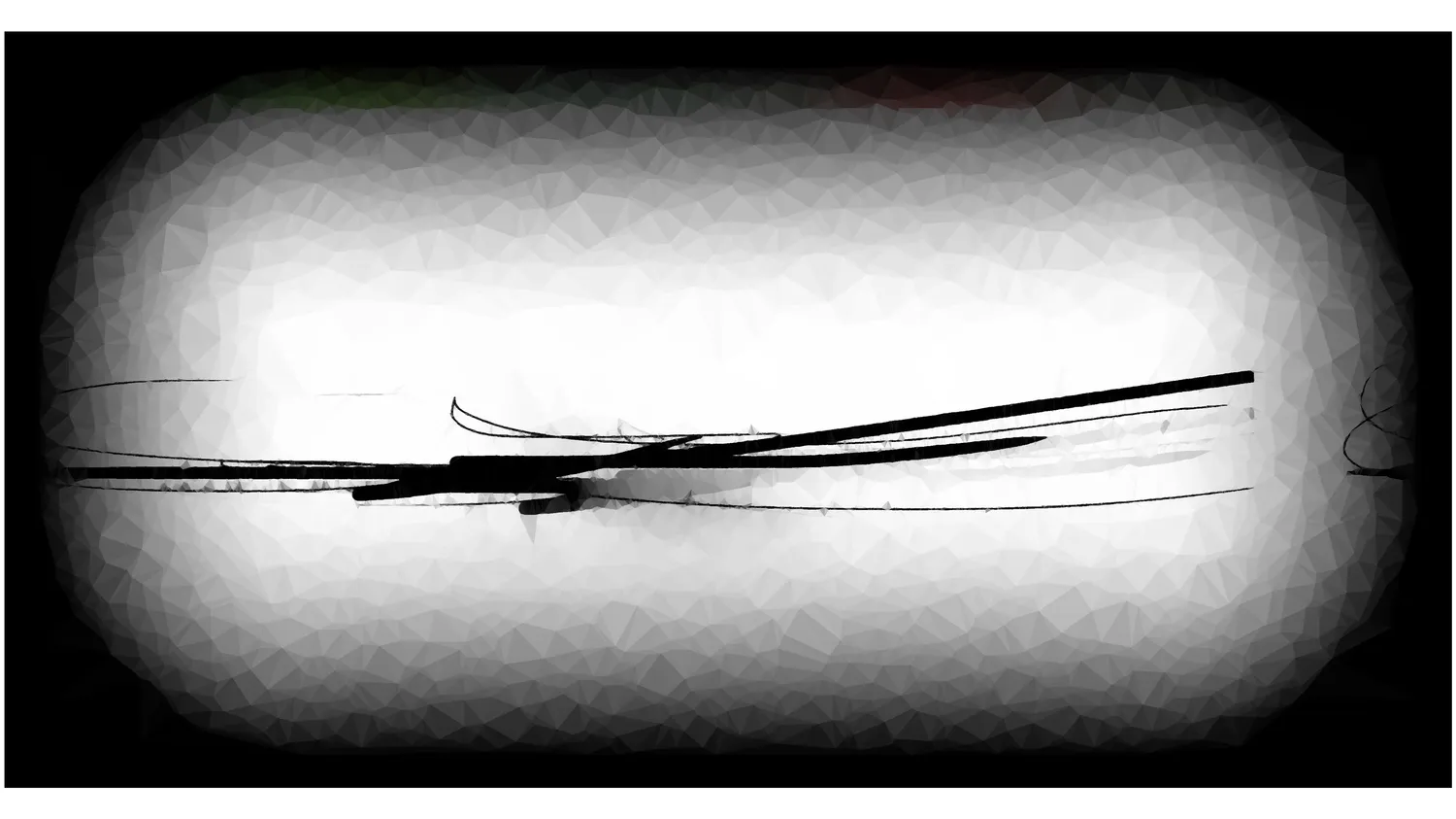 Framed by a case made of black wooden sticks.