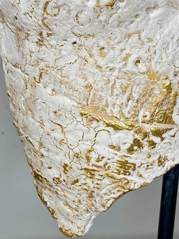 Pour cette œuvre, j'ai choisi l'acrylique, l'argile, la feuille d'or et la poudre de marbre pour créer un buste qui capture l'essence de la transformation et de la renaissance. L'aspect craquelé intégré à la texture et les éclats dorés symbolisent les imperfections et la beauté dans les fragments de notre être. Cette sculpture incarne l'éveil intérieur, apportant une énergie de renouveau et d'élégance intemporelle à tout espace de vie.