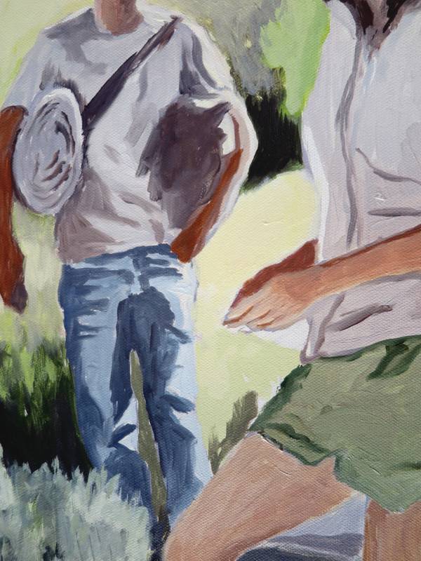 Groupe de personnages à l'arrêt dans la garrigue, les calanques. Photo prise sur le vif de gens en mouvement. Couleurs et formes des sujets et du territoires s'amalgament pour ne former qu'une seule vision de l'instant choisit. Le moment est inconnu, les personnages aussi. C'est la représentation d'un instant banal théâtralisé par le medium peinture sur toile.