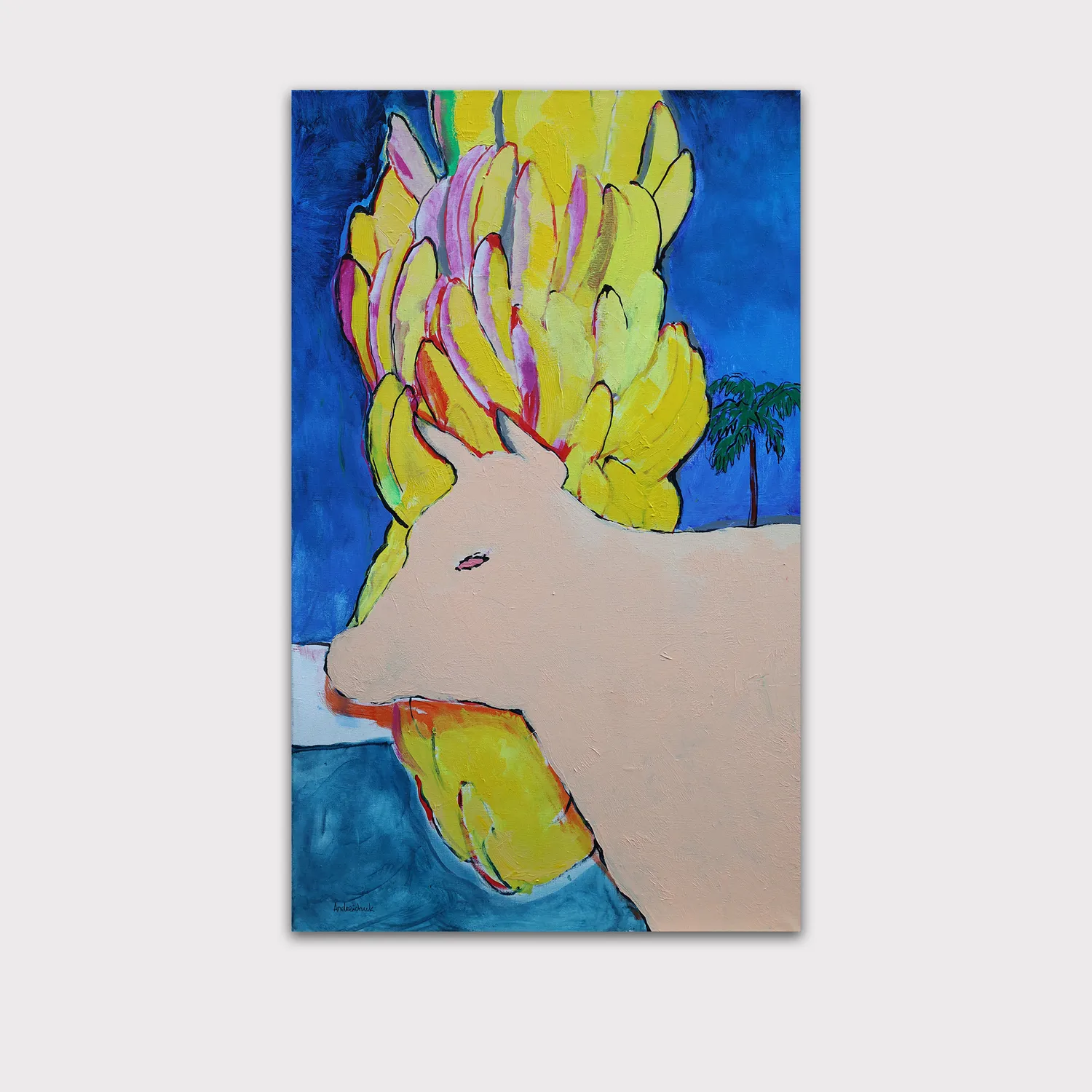 My new painting depicts a cow with bananas in the background. This painting was inspired by the music of the Velvet Underground and Blondie.