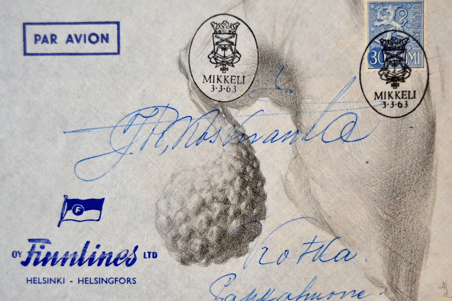 This drawing on a vintage Finnish envelope is the second in a series of surreal sketches capturing my state as a refugee in Finland. The twisted shape, reminiscent of armor or a snail shell, symbolically reflects compression and curling into an embryonic position ā a state of vulnerability and lack of security. It represents the second stage of post-traumatic stress disorder that emerged in me after being evacuated from my hometown.
