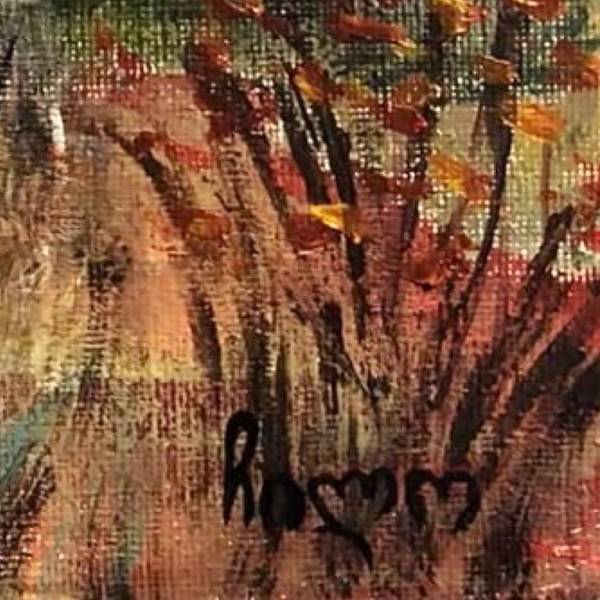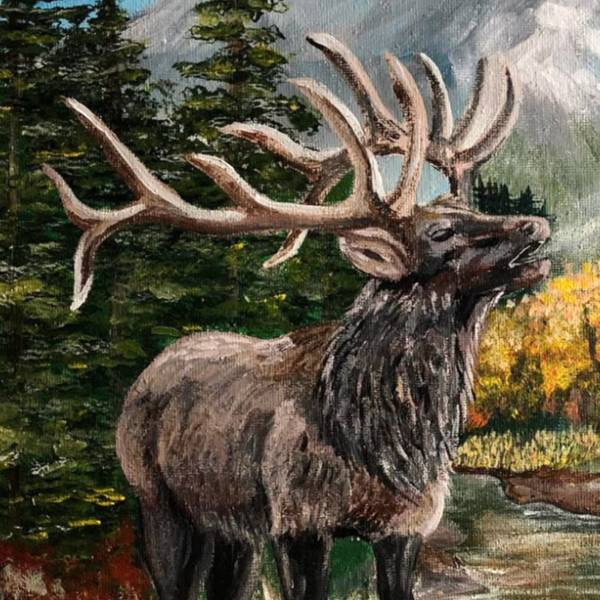 This is an image showing an artwork featuring a majestic elk in a natural setting, with a background of mountains, trees, and a stream.