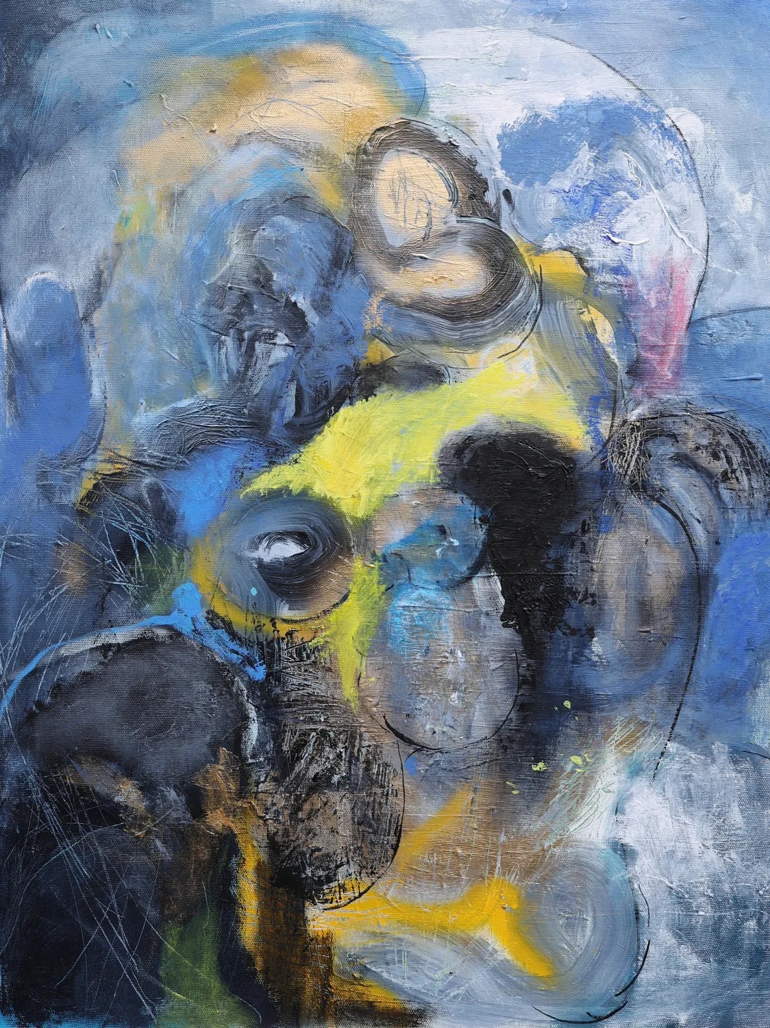 This abstract painting features a blend of swirling colors and textured layers that create an emotional and dynamic composition. The dominant palette includes shades of blue, black, and yellow, with subtle hints of white and muted red tones. The brushstrokes are expressive, ranging from smooth and flowing to sharp and chaotic, suggesting a sense of movement and depth. The interplay of colors and forms evokes a feeling of energy and introspection.