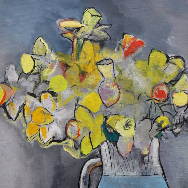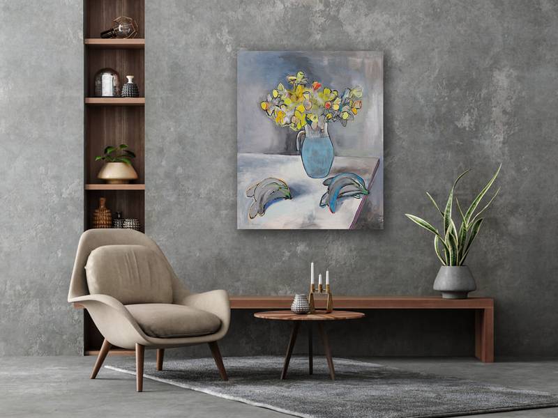 This delightful acrylic-on-canvas painting, titled "Daffodils and Bananas", brings an intriguing interplay of elegance and whimsy to life. The composition features a vibrant bouquet of daffodils in a charming blue pitcher, radiating warmth and vitality against a subtle gray background. Their lively yellows and soft oranges create a cheerful focal point that celebrates the beauty of springtime blooms.
