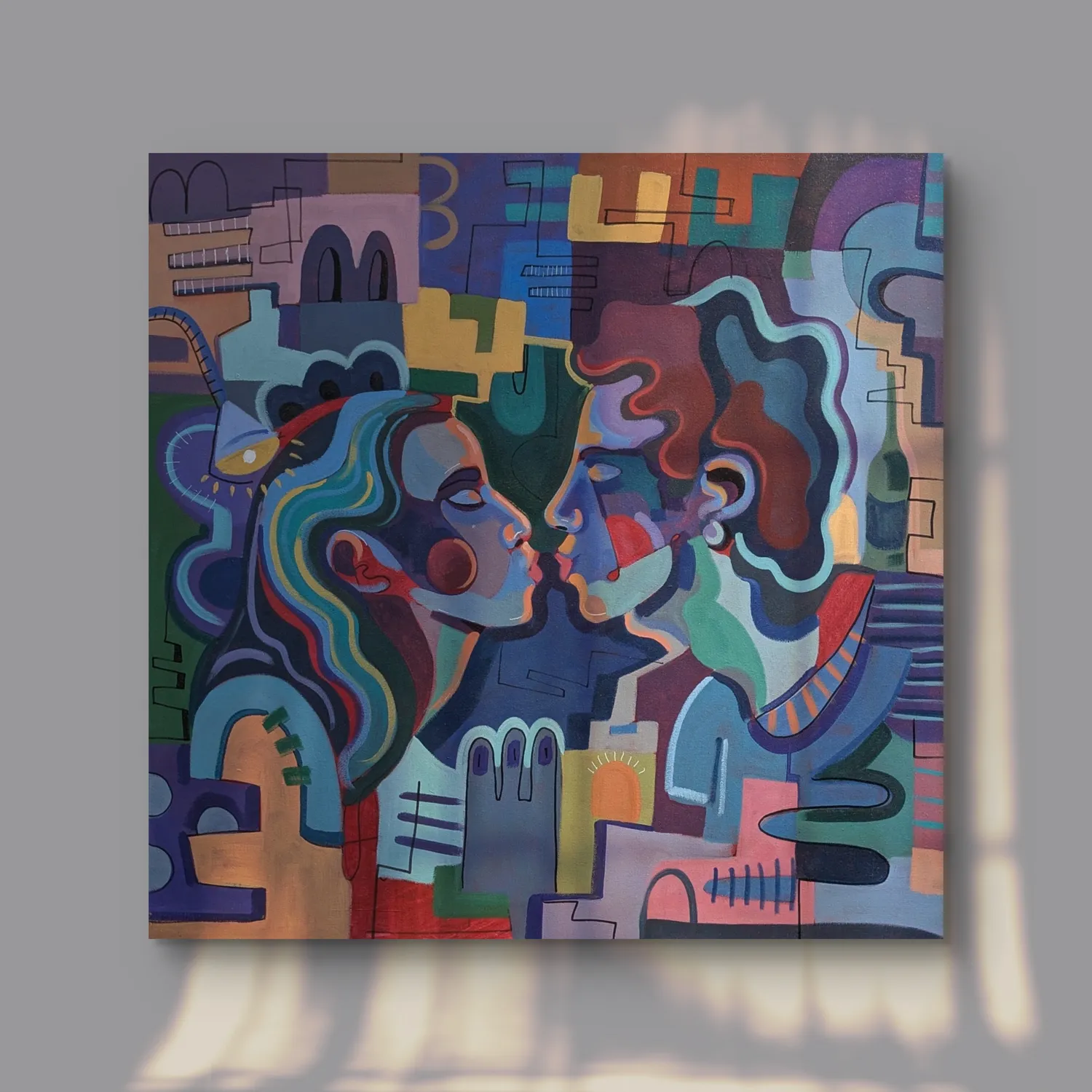 Part of the Half Moons series, this painting depicts two faces drawing near in a nocturnal setting. The geometric forms and fragmented structure suggest an ambiguity between presence and distance, desire and restraint.
