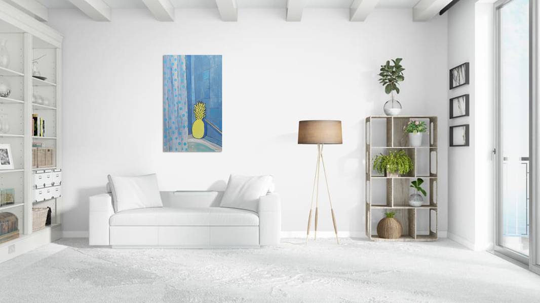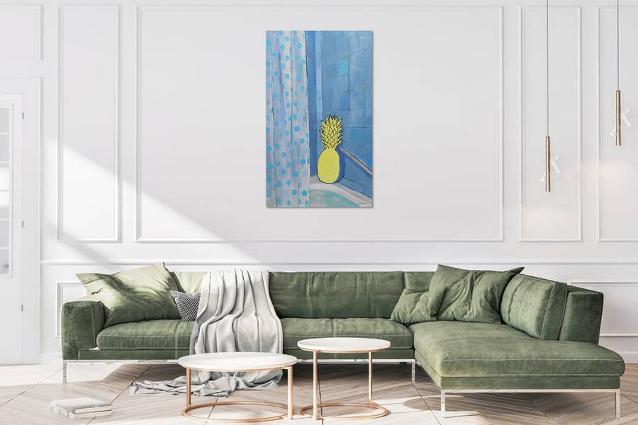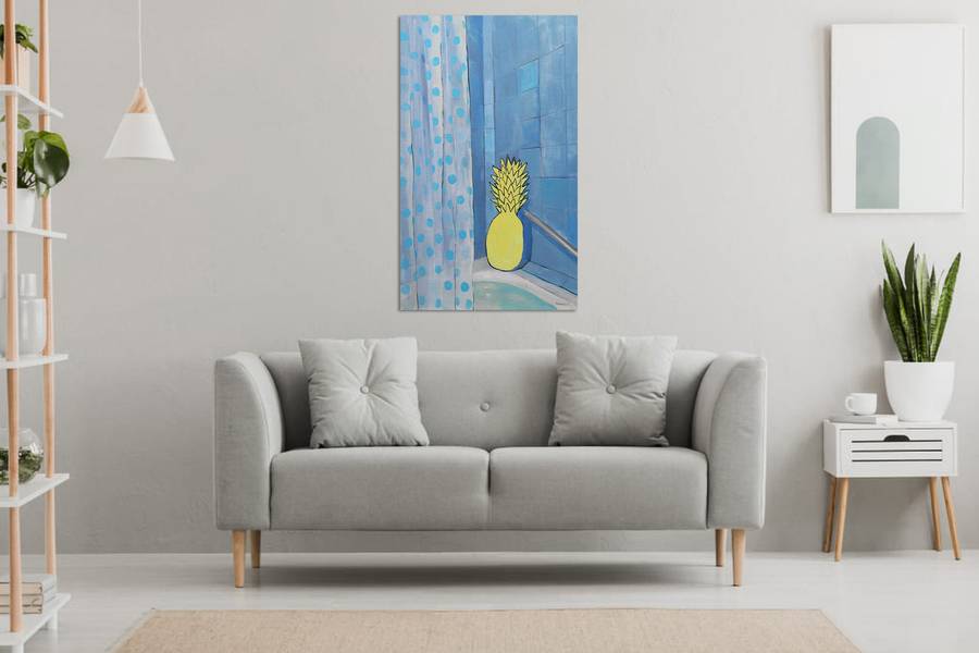 This captivating acrylic painting on canvas brings an unexpected twist to everyday life, blending surrealism with a touch of humor. The composition transports the viewer into a serene blue-tiled bathroom, where an unlikely protagonist—a vibrant yellow pineapple—rests against the wall, bathed in soft light.