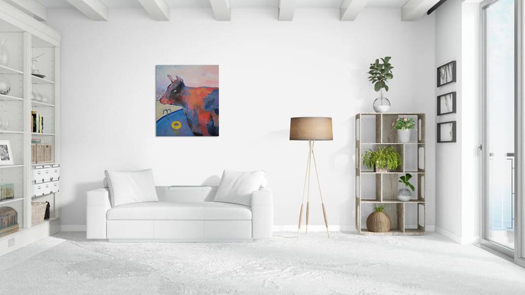 This surreal acrylic painting on canvas invites the viewer into a dreamlike world where reality and imagination blur. A majestic cow, painted in deep blues, fiery reds, and soft purples, stands beside a tranquil swimming pool under a pastel-hued sky. The crescent moon hovers gently above, adding a mystical touch to the scene. The unexpected contrast between the animal’s presence and the leisure setting sparks curiosity—what is the story behind this moment?