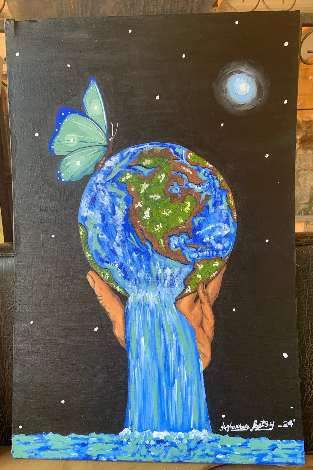 “Puissance Aesthetic” is a visually striking painting that conveys a powerful message about the connection between nature, humanity, and the cosmos. The central focus is the Earth, cradled gently by a pair of human hands, symbolizing care, responsibility, and the interdependence between humans and the planet. Water cascades from the Earth, transforming into a flowing waterfall, representing life, renewal, and the essential role of water in sustaining existence.