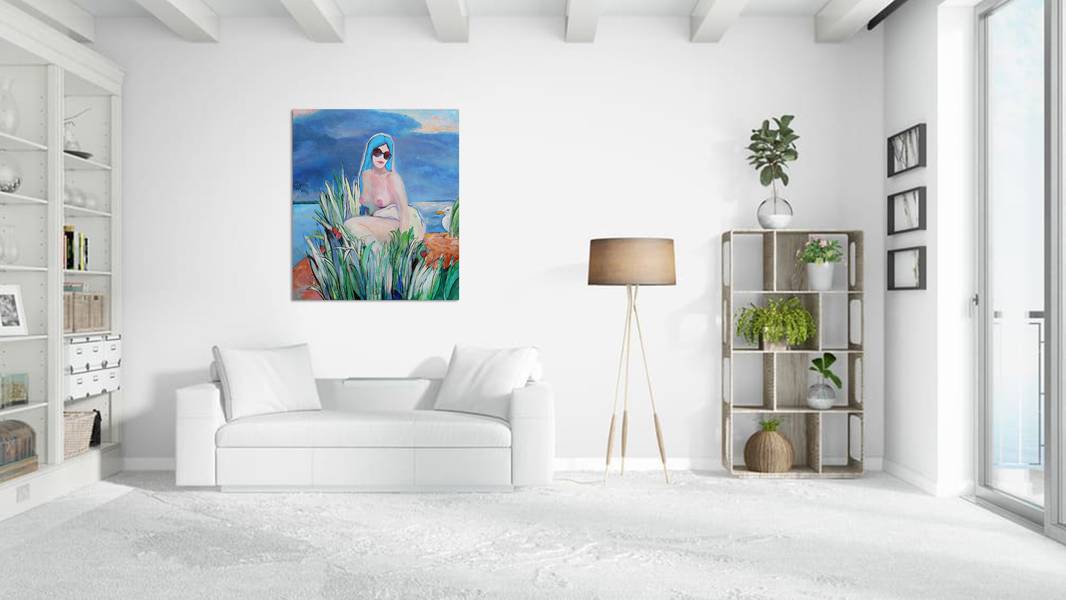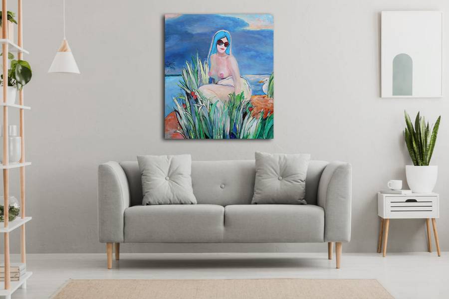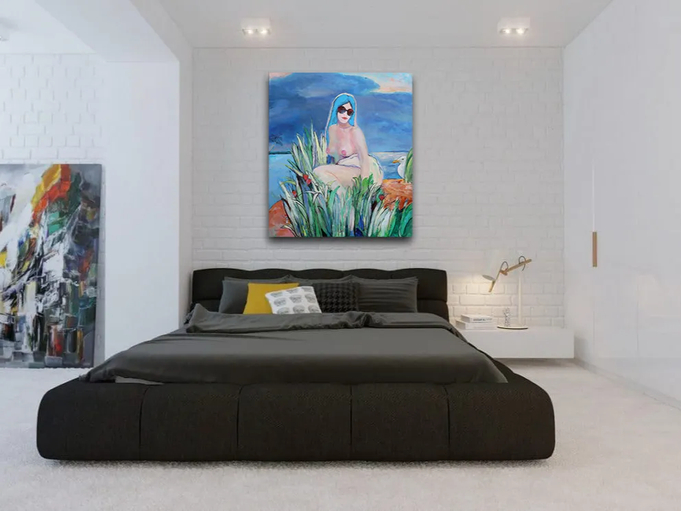 This acrylic-on-canvas painting captures a moment of serene contemplation amidst the untamed beauty of nature. The central figure, adorned with striking blue hair and oversized sunglasses, merges modernity with myth, blending a sense of mystery and individuality. Her relaxed pose and direct yet distant gaze invite the viewer to reflect on themes of freedom, self-expression, and vulnerability. The lush vegetation, with vibrant greens and pops of red physalis flowers, symbolizes life's abundance and the intricate connection between humanity and nature. The presence of the seagull introduces a sense of motion and companionship, hinting at the larger world beyond the frame. The soft palette contrasts with the bold, dramatic sky, underscoring the dynamic between calm introspection and the unpredictable forces of the natural world. This painting evokes a mood of quiet empowerment, celebrating the harmony of solitude and the vibrant energy of the wild.