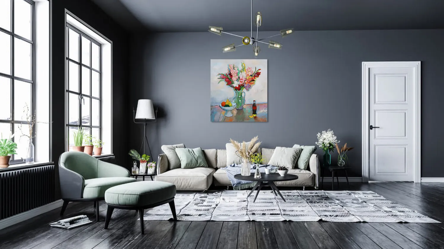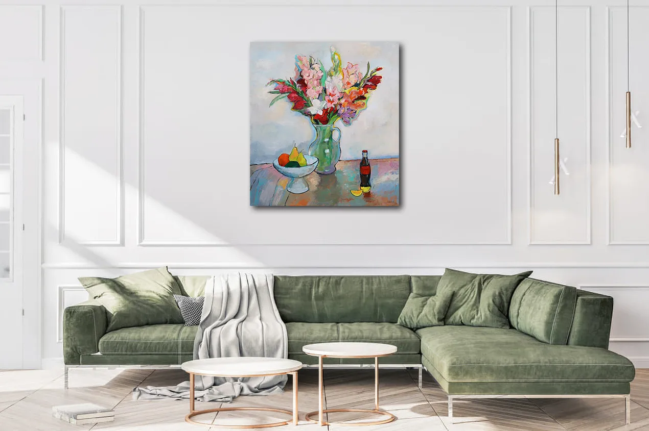 This stunning acrylic painting on canvas captures a moment of timeless elegance and warmth. A lush bouquet of gladioluses in full bloom bursts from a delicate green pitcher, their petals a lively dance of pinks, reds, whites, and purples. Each brushstroke radiates energy, giving the flowers a fresh, almost tangible presence, as if they were just gathered from a sun-drenched garden.