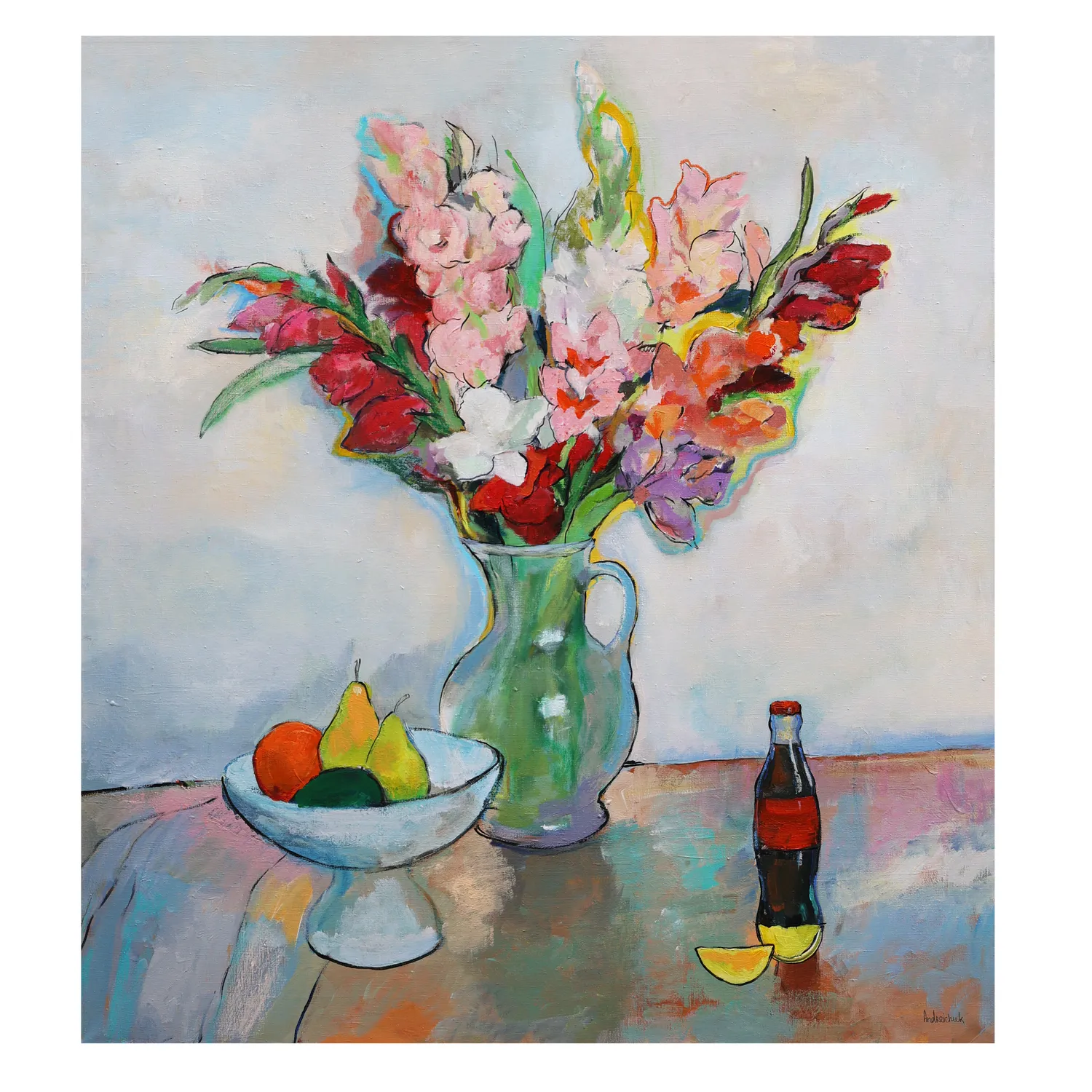 The still life composition extends beyond the floral arrangement, drawing the viewerās eye to a bowl of ripe fruitāgolden pears, a deep green lime, and a vibrant orangeāresting gracefully on a pedestal dish. To the side, a classic glass bottle of Coca-Cola stands next to a freshly sliced lemon, an unexpected but charming detail that adds a modern touch to the otherwise timeless scene. The reflective tabletop shimmers with hints of color, subtly mirroring the objects and creating a sense of depth and harmony.