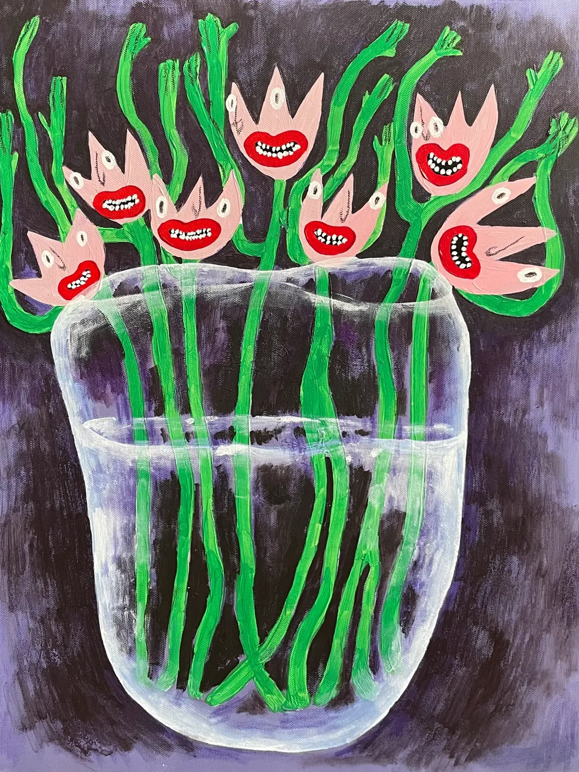 I am engaged in painting, in the direction between primitivism, naive art and art brut. I mainly work with acrylic and oil, and almost every work includes acrylic balloons, dry pastels, and texture pastes.