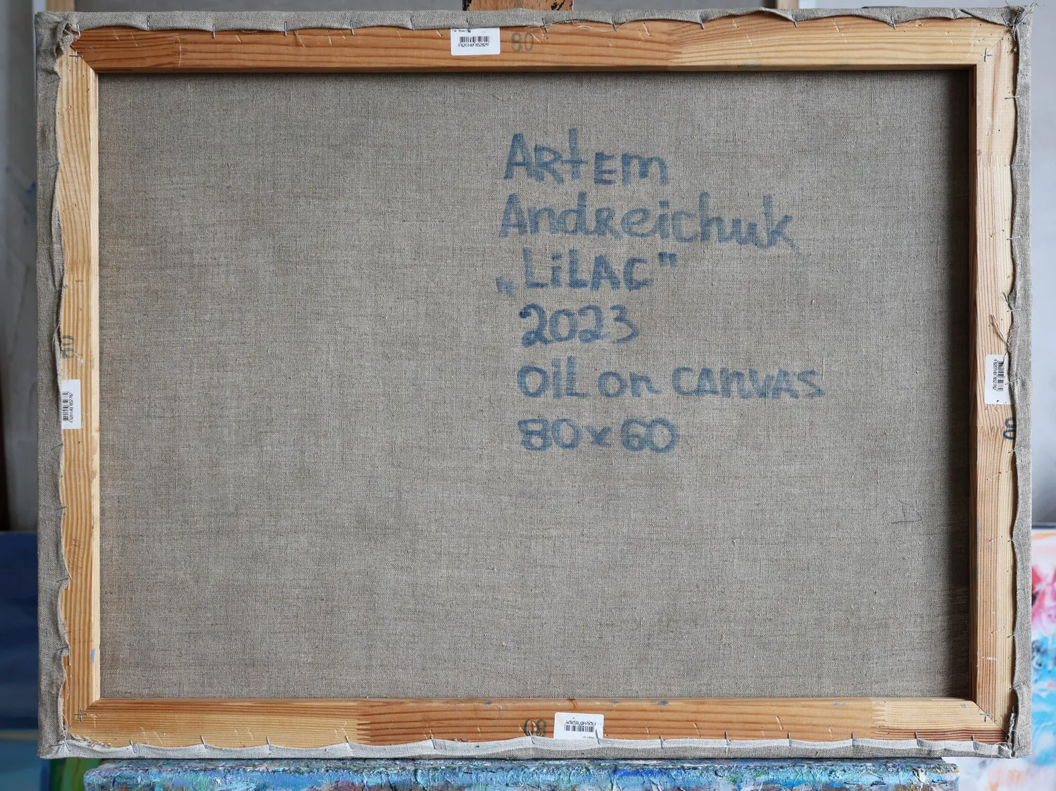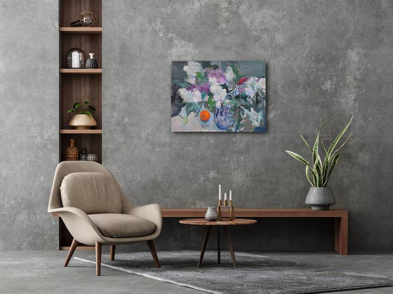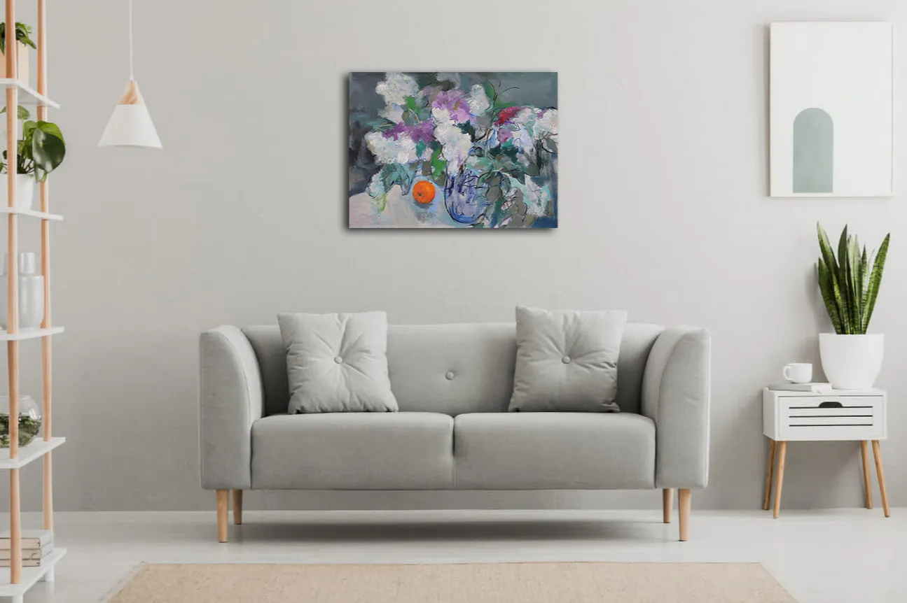This captivating oil painting on canvas is an exquisite blend of impressionistic beauty and raw emotion. A bouquet of lilacs, rendered in soft whites, deep purples, and hints of crimson, spills gracefully from a delicate blue glass vase. The fluid, expressive brushstrokes create a dreamy, almost ethereal atmosphere, as if the flowers are caught in a fleeting moment of movement.