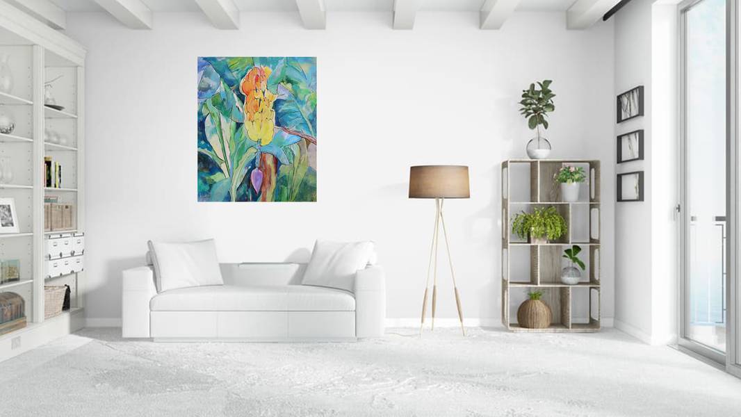 This stunning acrylic painting on canvas bursts with life and color, capturing the wild essence of a tropical jungle. At its heart stands a magnificent banana flower, its golden-yellow and fiery orange hues glowing against a lush background of broad, deep-green leaves. The artist’s expressive brushstrokes and bold black outlines give the composition a dynamic, almost rhythmic energy, making the fruit seem to pulse with vitality.