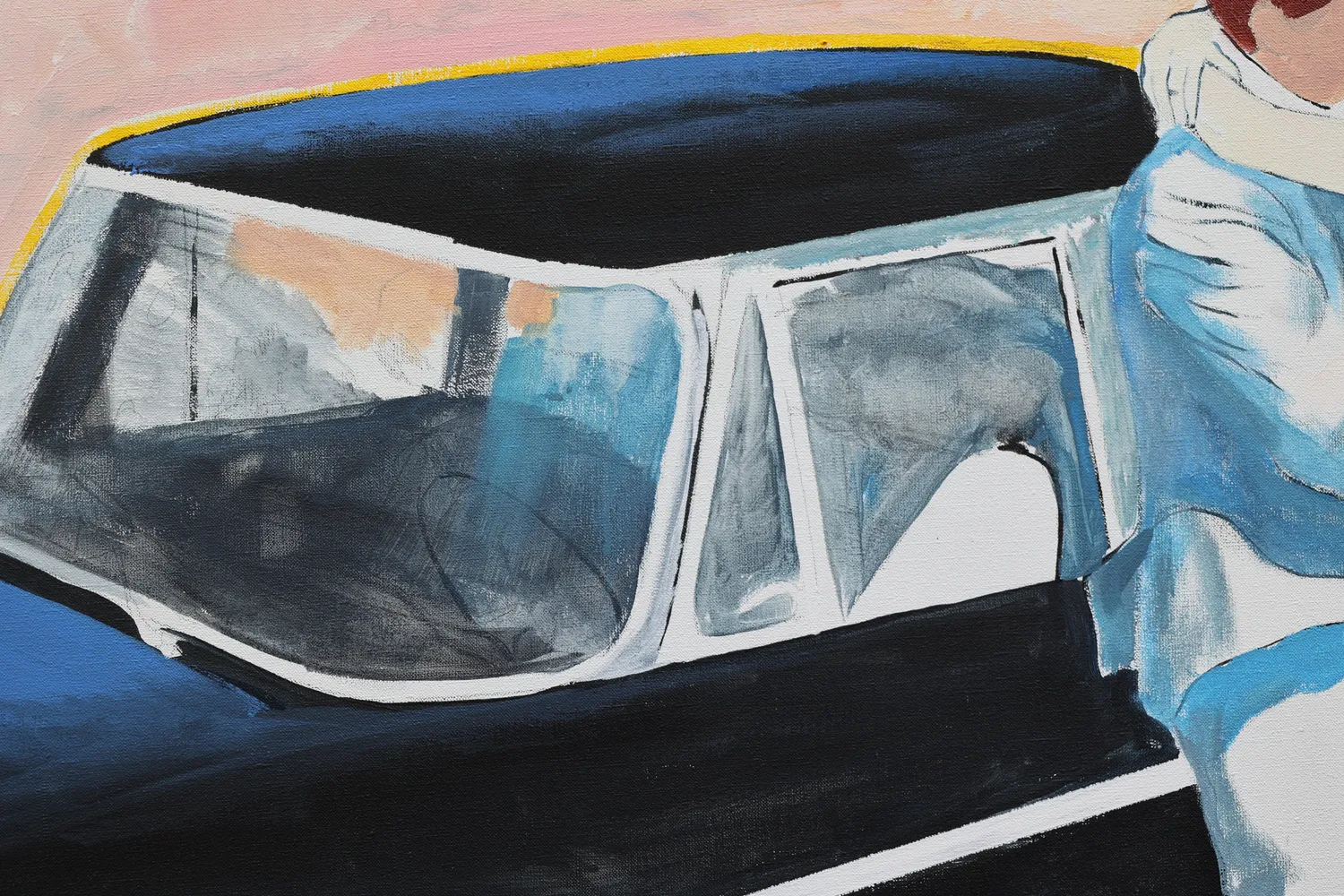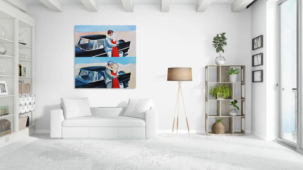 This evocative acrylic painting on canvas captures a timeless embrace, frozen in two mirrored moments. A couple stands locked in a passionate kiss beside a sleek black vintage car, their figures bathed in a warm, nostalgic glow. The woman, wrapped in a flowing red dress, leans into the embrace, her platinum hair catching the light, while the man, dressed in a pale suit, holds her close.