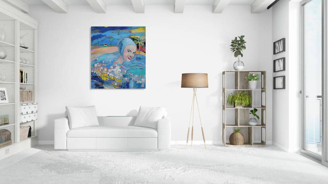 This mesmerizing acrylic painting on canvas immerses the viewer in a dreamlike world where reality and fantasy blend effortlessly. A woman emerges from the water, her face turned toward us with a playful yet enigmatic smile. She wears a vintage-style swimming cap, evoking a sense of nostalgia, as if she has stepped out of an old seaside postcard. Her red lips contrast sharply with the cool blues of the water, making her presence both striking and surreal.