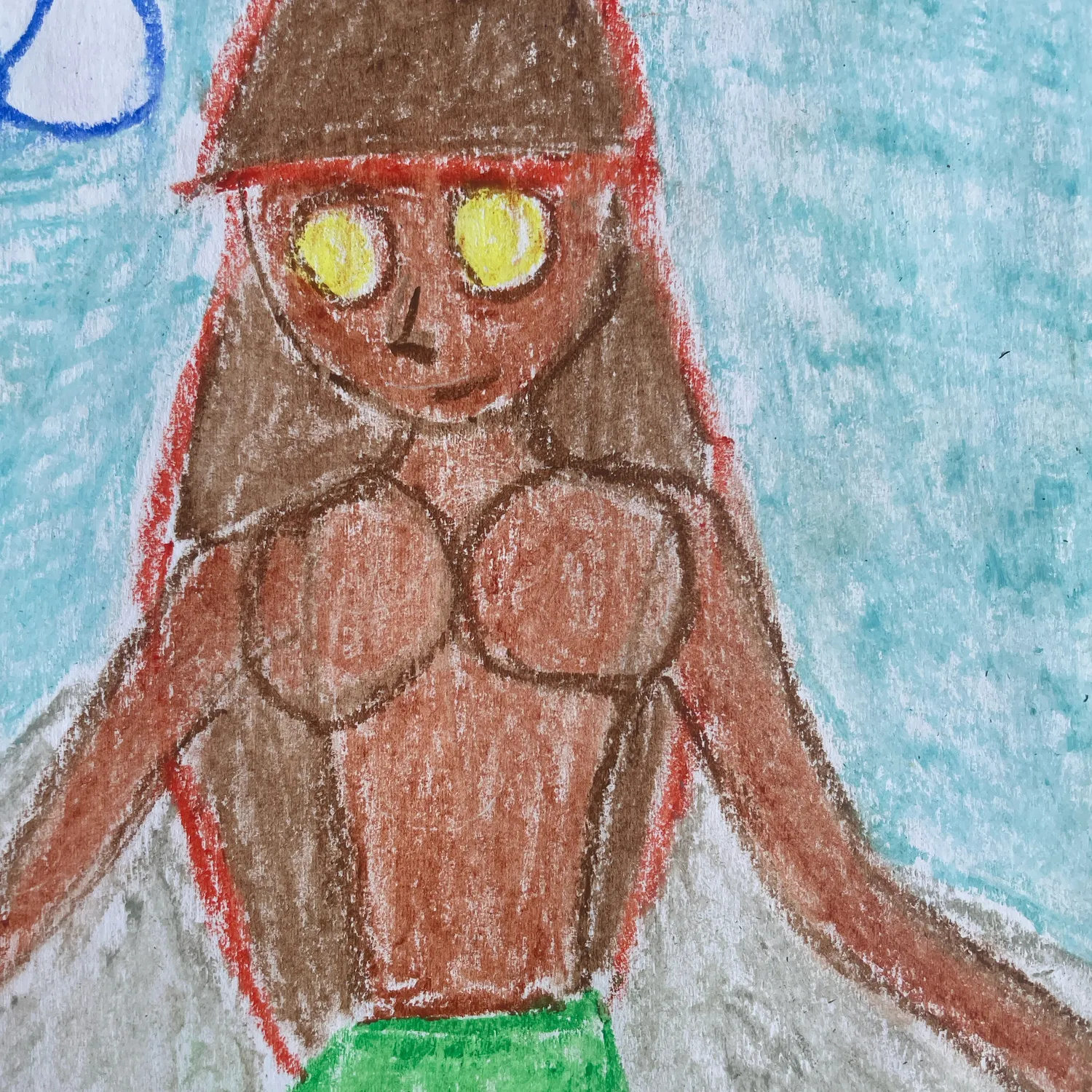 This cubist artwork, made on A4 paper with oil pastels, depicts the Brazilian legend of the Iara series, an indigenous mermaid. The work was painted in a crude manner to express indigenous culture through cubism.