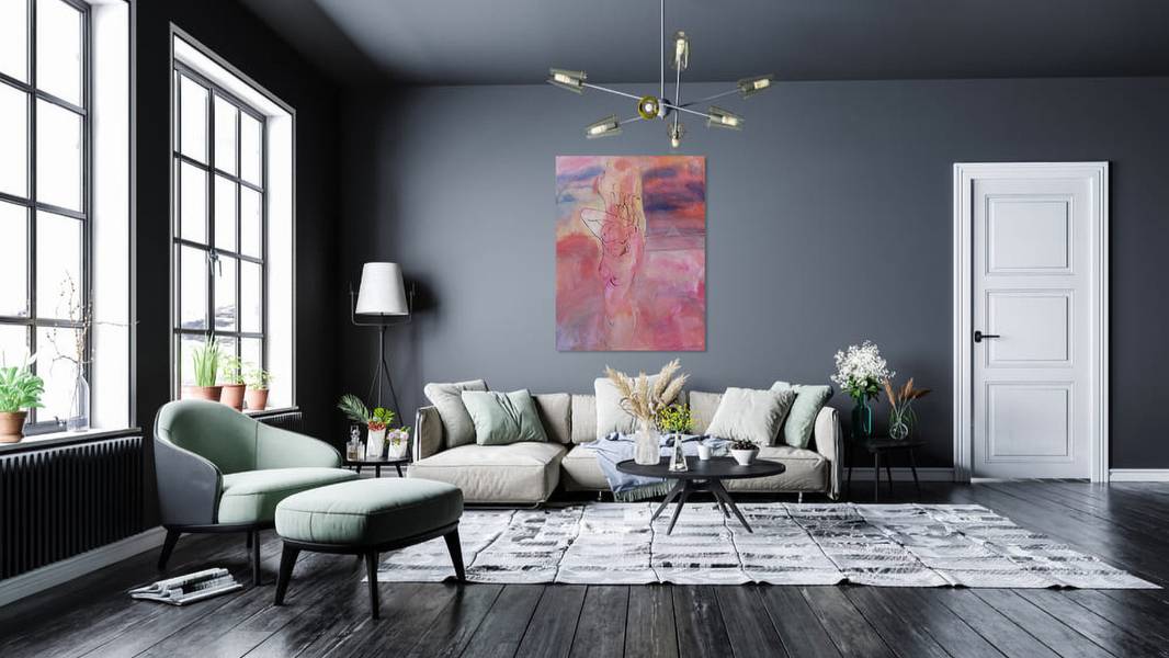 This acrylic painting on canvas is a poetic blend of softness and power, of ethereal femininity and mythological mystery. The central figure, a nude woman, stands in a dreamlike haze of pinks, corals, and soft oranges, as if she is emerging from the very essence of the sunset. Her form is delicately outlined in black, her posture intimate yet strong—arms raised behind her head in a gesture that feels both relaxed and ceremonial.