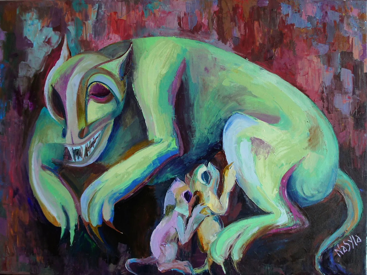 These works are about strength, loneliness, and defiance. My beast is neither good nor evil; it is different. Like all living creatures, it wants peace and love. I painted these canvas just before the outbreak of the war in Ukraine. They are full of a subconscious premonition of inevitable changes, a feeling that something hard and tragic is coming.
