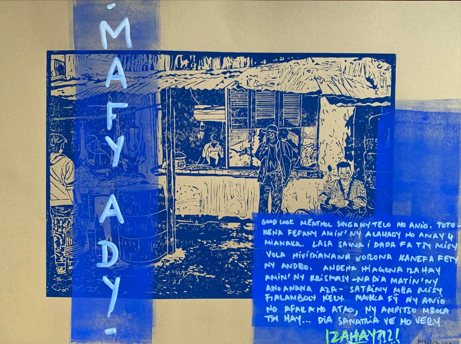 Madagascar and its traditions have shaped Miora Acker’s journey. Having grown up in this environment, Madagascar is deeply ingrained in her DNA and is today the core of her work. Her multicultural background, which was initially a source of disorientation, prompted her to embark on a search for identity. Through her art, she delves into the multifaceted nature of identity, examining the interplay of cultural influences, social challenges, and personal narratives. She explores the historical and contemporary realities of Malagasy society, investigating themes such as colonialism, animism, syncretism, and the impact of socio-economic disparities. Her work depicts situations and scenes of everyday life and allude to current social and cultural landscapes.