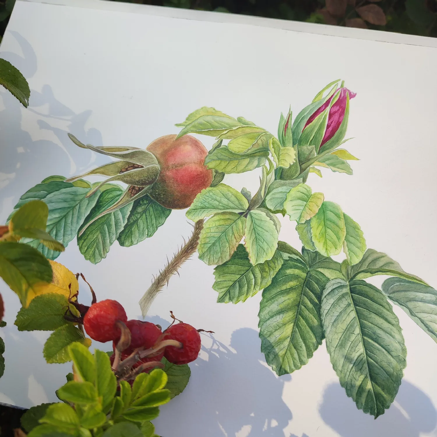 What thoughts arise when observing a rosehip branch, where a fruit ripens while a new flower blooms? Perhaps it's about the support of our loved ones, which we need regardless of our age. Or maybe it's about how, when we feel like we've reached a peak, a second wind appears, showing us new opportunities for growth. Or maybe it's about how life continues and is carried on in our children and our deeds.