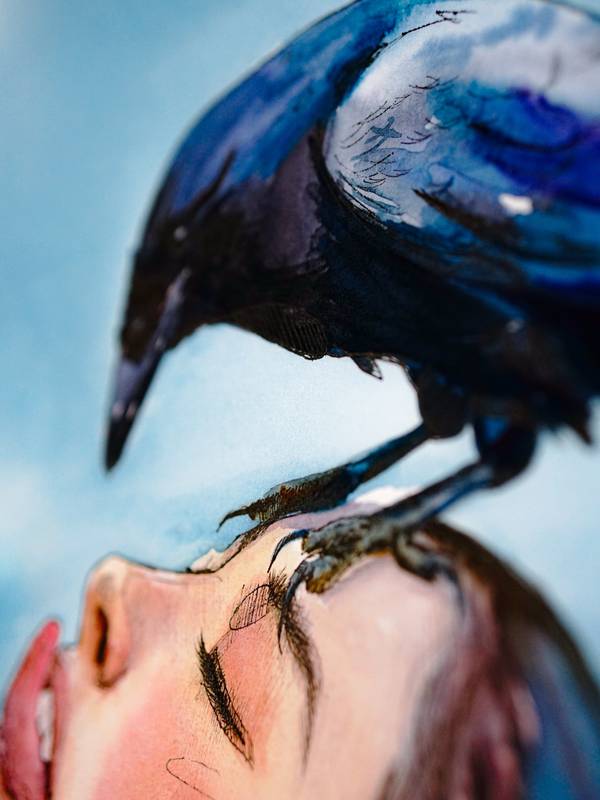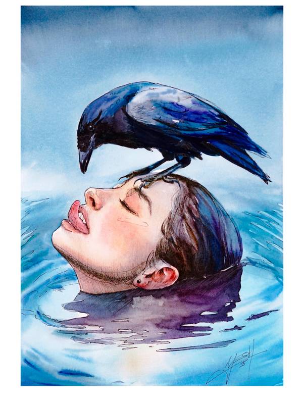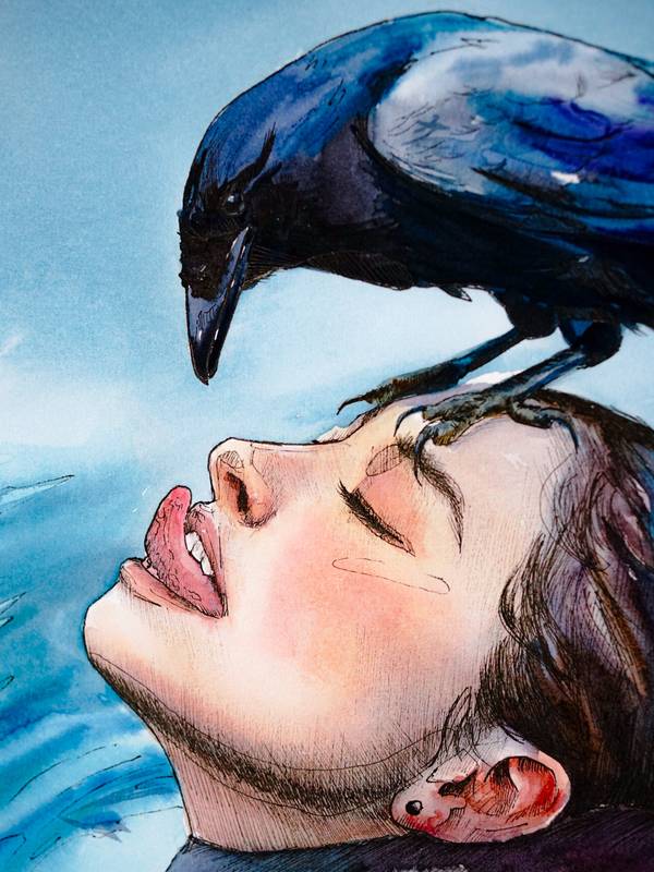 A girl rises from water, profile view, tongue out. A crow perches on her forehead, head lowered, staring at the tongue. Tension between playfulness and omen. Minimalist, surreal mood.