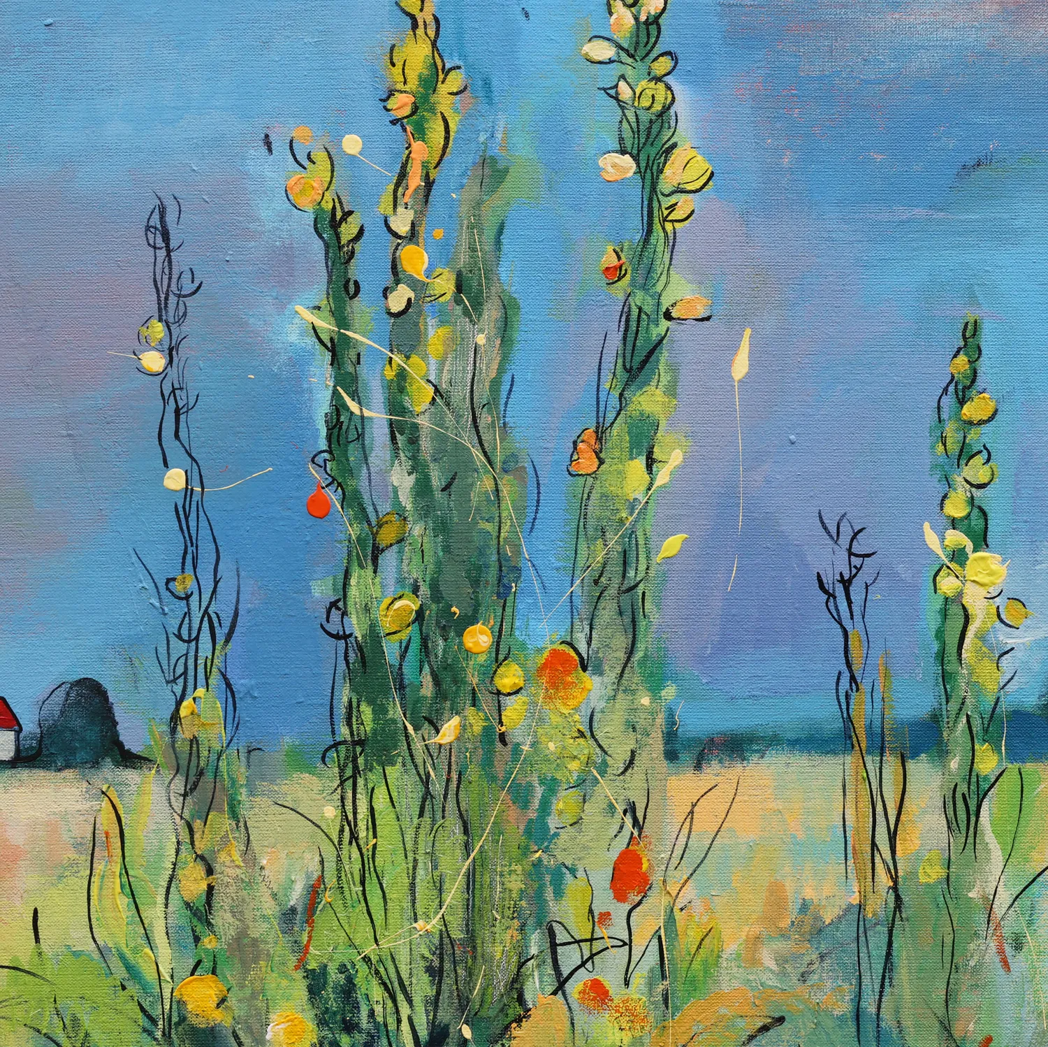 This acrylic painting on canvas is a vibrant celebration of natureās wild poetry. Towering stalks of verbascum tall, flowering plants with soft yellow and orange blossomsārise with confident elegance in the foreground, their presence both structured and spontaneous. The brushstrokes are expressive, suggesting a breeze moving through the scene, while the layering of color gives the greenery a sense of glowing life.