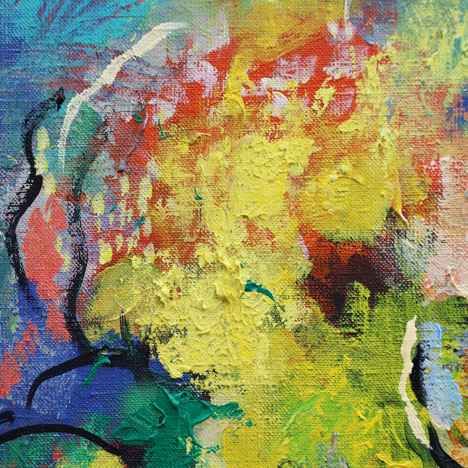 The composition skillfully balances structure and freedom, with delicate blossoms outlined in black, emerging from a riot of color. It’s a celebration of nature and artistic emotion — perfect for brightening up modern living spaces or adding a statement piece to a contemporary art collection.