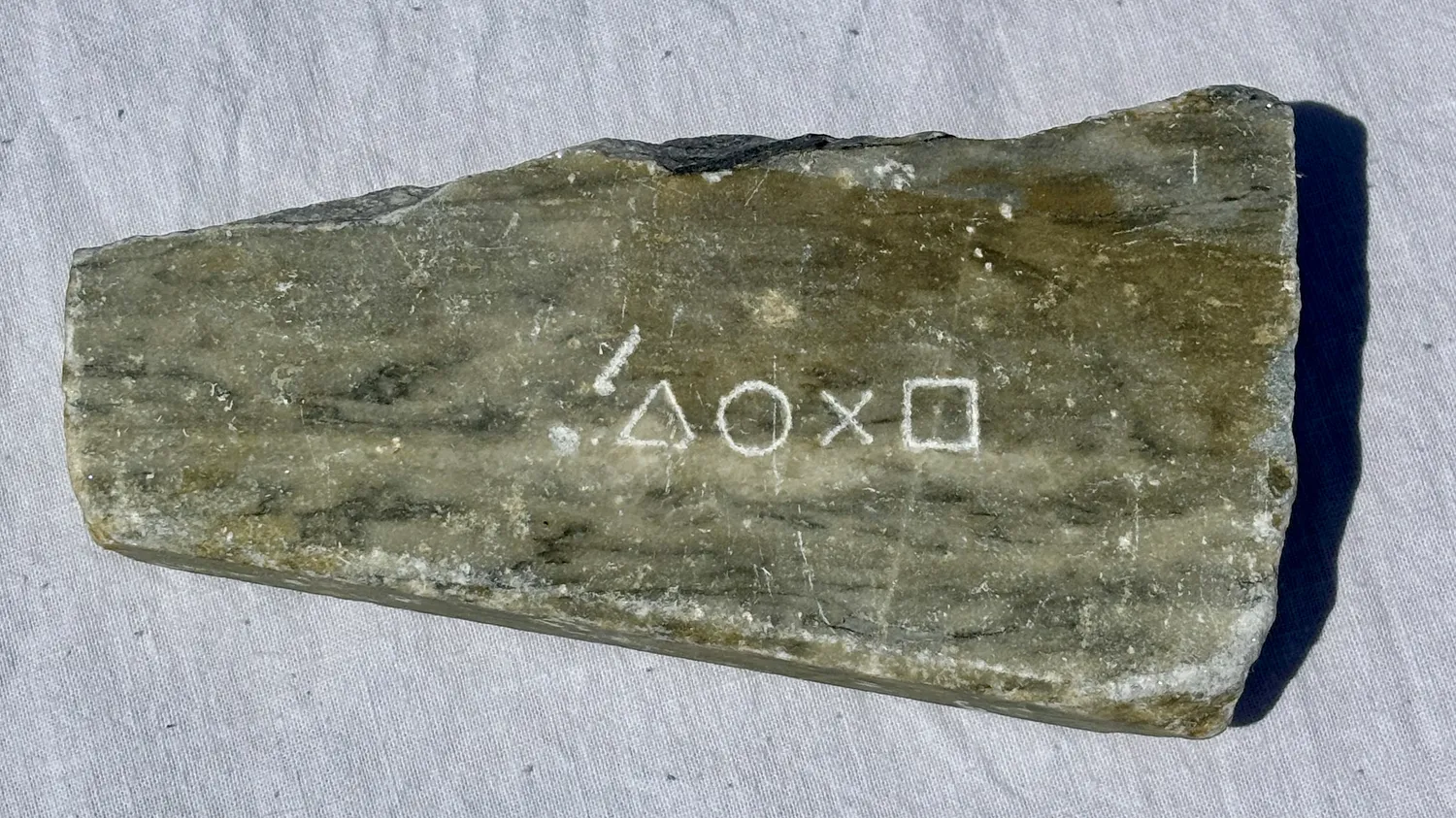 Play Sea Stone (⧈ × ◇ ∇) is a minimalist intervention on an ancient material, inscribed not with language but with memory. The stone, found by the sea and shaped by time, bears four carefully hand-carved symbols universally recognizable to some, yet cryptic to others.