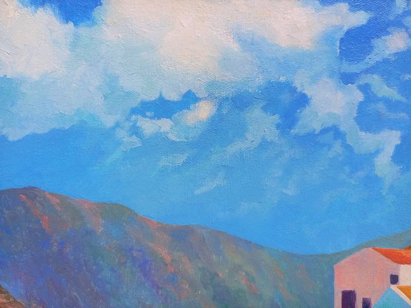 At midday, the sky, sea, boats, promenade, light umbrellas, and house facades all melt into one. This is a corner of absolute calm, where time flows slowly and silence is filled with sunlight and breeze. The roofs in red ochre, the multicolored walls form a festive, open palette, while human figures are nearly dissolved into color — like shadows of memories from a summer that never ends. The painting invites you into a world where the sea calls for the refined joy of rest.