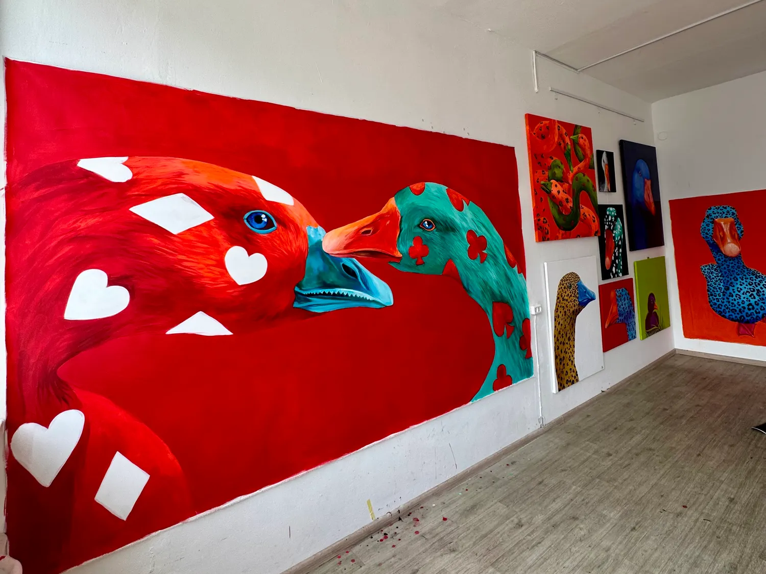 This painting is my vision of the idea of a game between two worlds, embodied in geese “dressed” in playing card symbols.