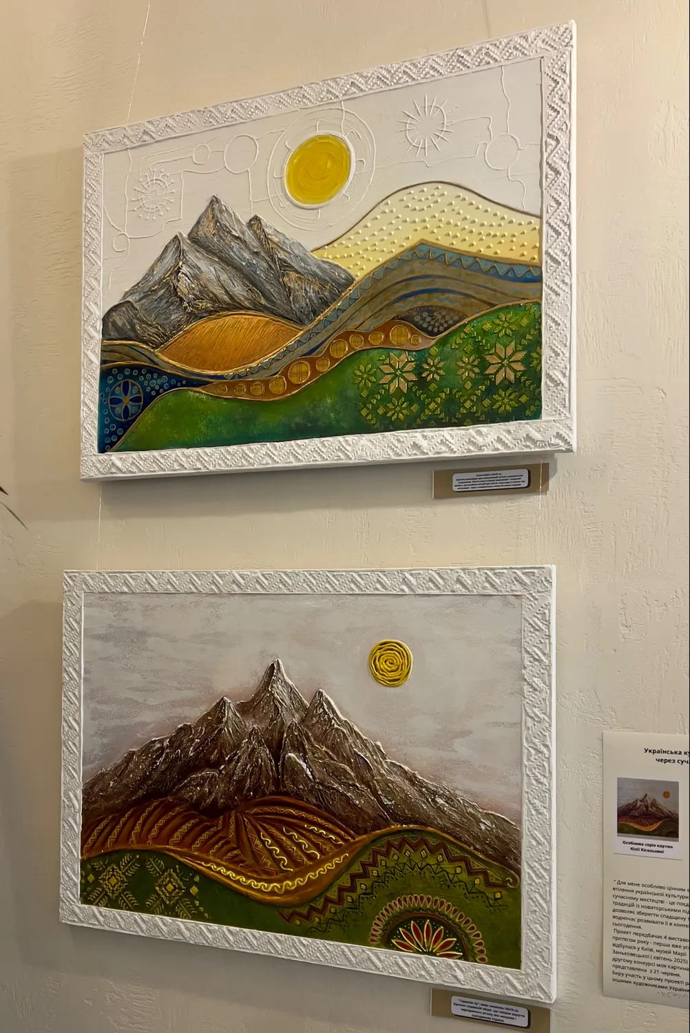 The golden circle in the center of the composition is a solar symbol that represents the eternal movement of life, the power of the family and protection from adversity - one of the oldest amulets of our ancestors. The mountains embody the indomitable Ukrainian spirit, and the wavy lines with ancient patterns convey the code of national memory. Green fields with golden cross-shaped ornaments show the power of Ukrainian embroidery as a protective symbol. Traditional ornaments - from the centered rotary to geometric patterns - are not just decorations, but living amulets that preserve the wisdom of generations.