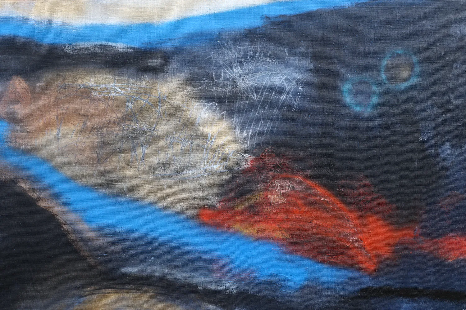 This abstract acrylic painting on canvas (120x100 cm) unfolds like a poetic landscape of inner and outer worlds. Golden tones emerge from the surface like hidden memories, while deep blues and blacks suggest infinite night and the quiet power of the subconscious. A sudden flash of red ignites the composition, evoking transformation, passion, and the raw pulse of existence.