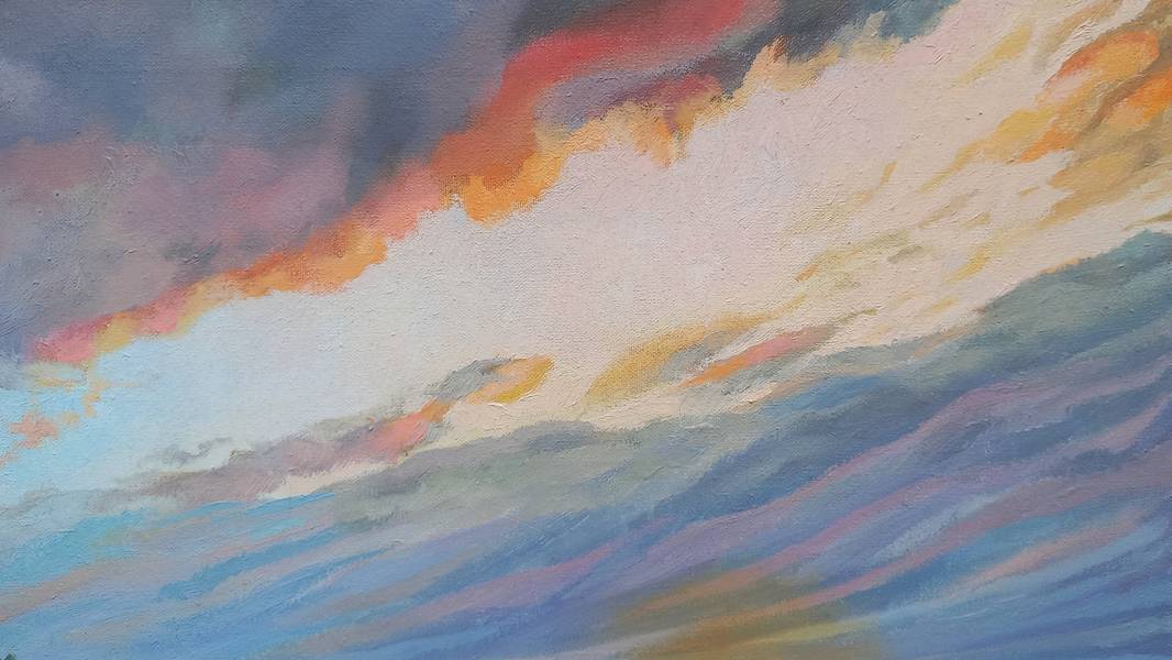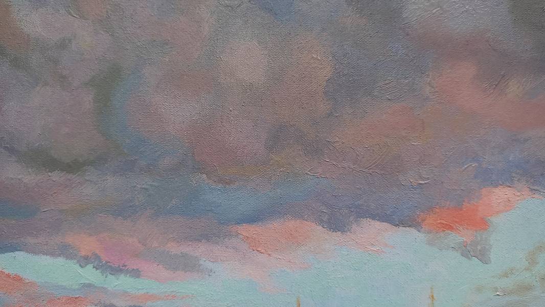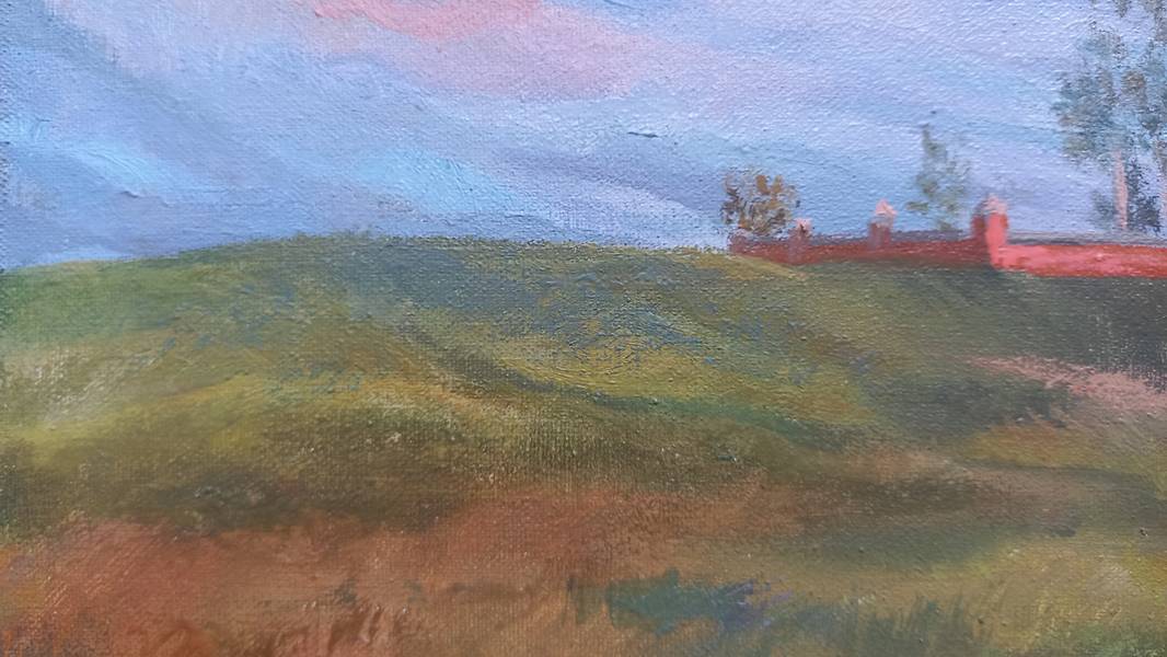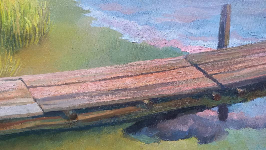 In this landscape, silence becomes almost tangible. The low sun paints the sky in delicate transitions of lilac, rose, and golden tones, gently mirrored in the glassy surface of the river. In the foreground, a wooden pier leads to the water; it becomes a point of entry into the space, as if inviting the viewer to take a step toward the quiet current. On the left bank, a white-stone church with blue domes, framed by trees, serves as a visual anchor in this extended horizontal composition. Warm ochres and greens of the riverbanks echo the cool celestial hues, creating a balanced color harmony. The movement of clouds and water is barely perceptible — time seems suspended at the moment when day yields to night. The composition is arranged so that the viewer’s gaze slowly drifts from the pier through the bright horizon into the quiet depth of the reflections, entering a state of meditative contemplation.